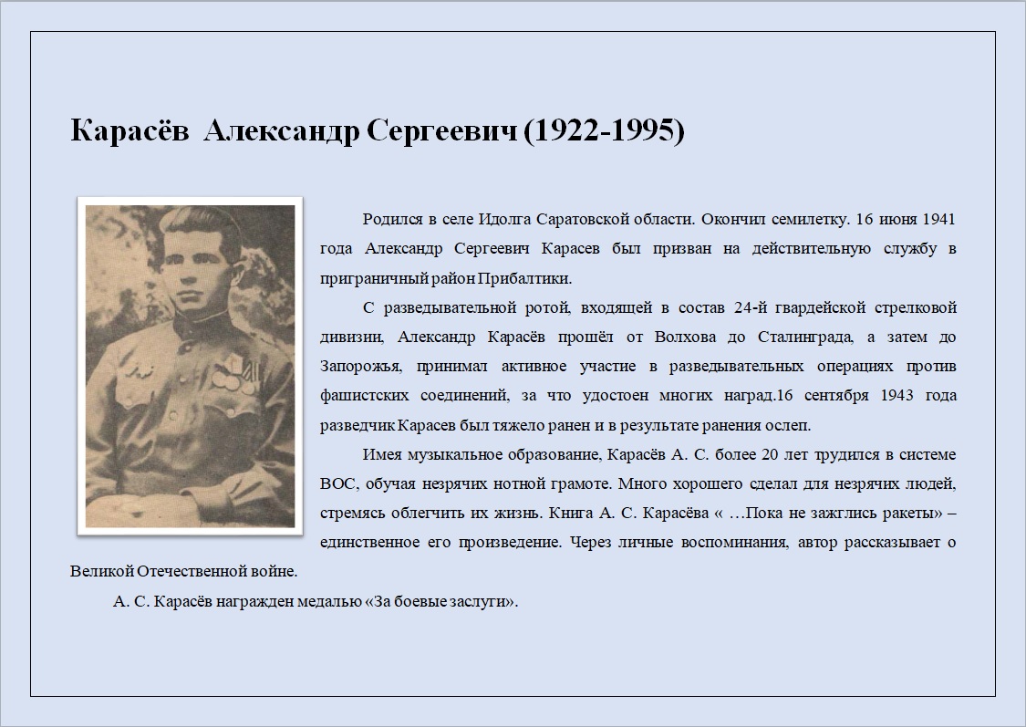 Цикл виртуальных выставок «Писатели и поэты-фронтовики, потерявшие зрение». Карасёв Александр Сергеевич (1922 – 1995)