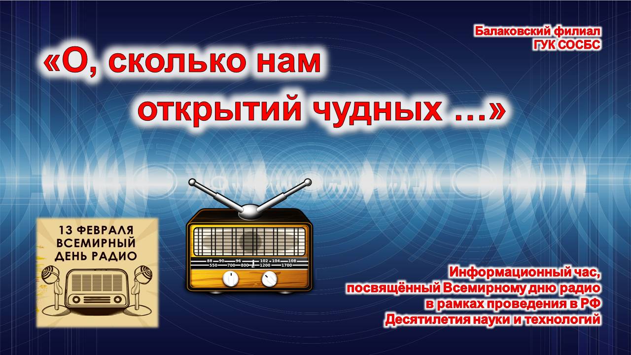 Балаковский филиал Областной специальной библиотеки для слепых подготовил для учащихся МАУК «СОШ №7» города Балаково информационный час, посвящённый Всемирному дню радио в рамках проведения в Российской Федерации Десятилетия науки и технологий.