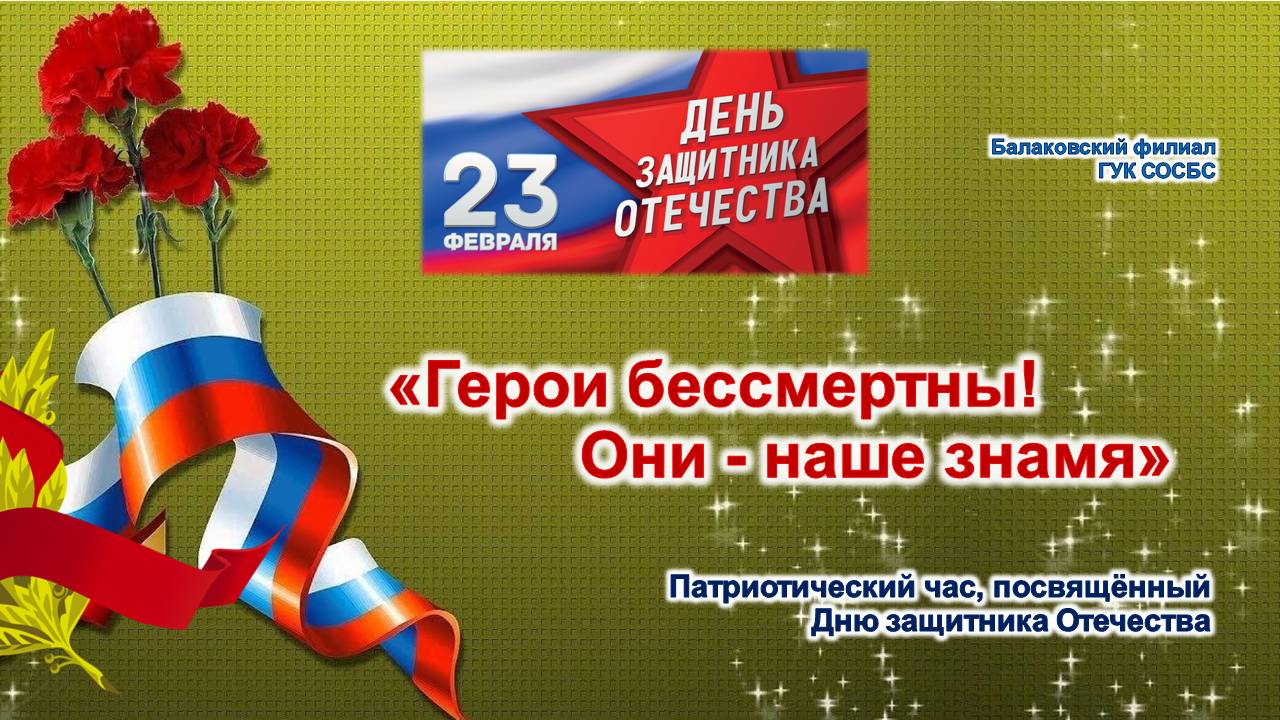 Балаковский филиал Областной специальной библиотеки для слепых подготовил для своих читателей патриотический час, посвящённый Дню защитника Отечества. Мероприятие рассказало о мужестве и славе защитников Отечества, об истории создания армии нашей страны, об основных вехах её развития, о патриотизме русской армии, о знаменитых воинах, прославивших Россию с древних времён и до нашего времени, в том числе об участниках специальной военной операции России на Украине. Прозвучали поэтические и музыкальные произведения о людях, готовых бороться за свободу и независимость своей страны, за благополучие и процветание её граждан, за справедливость и историческую память.