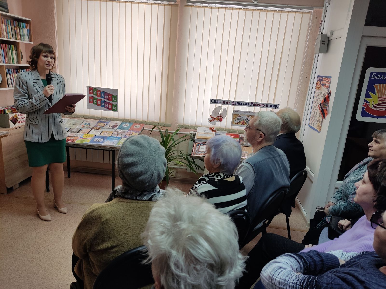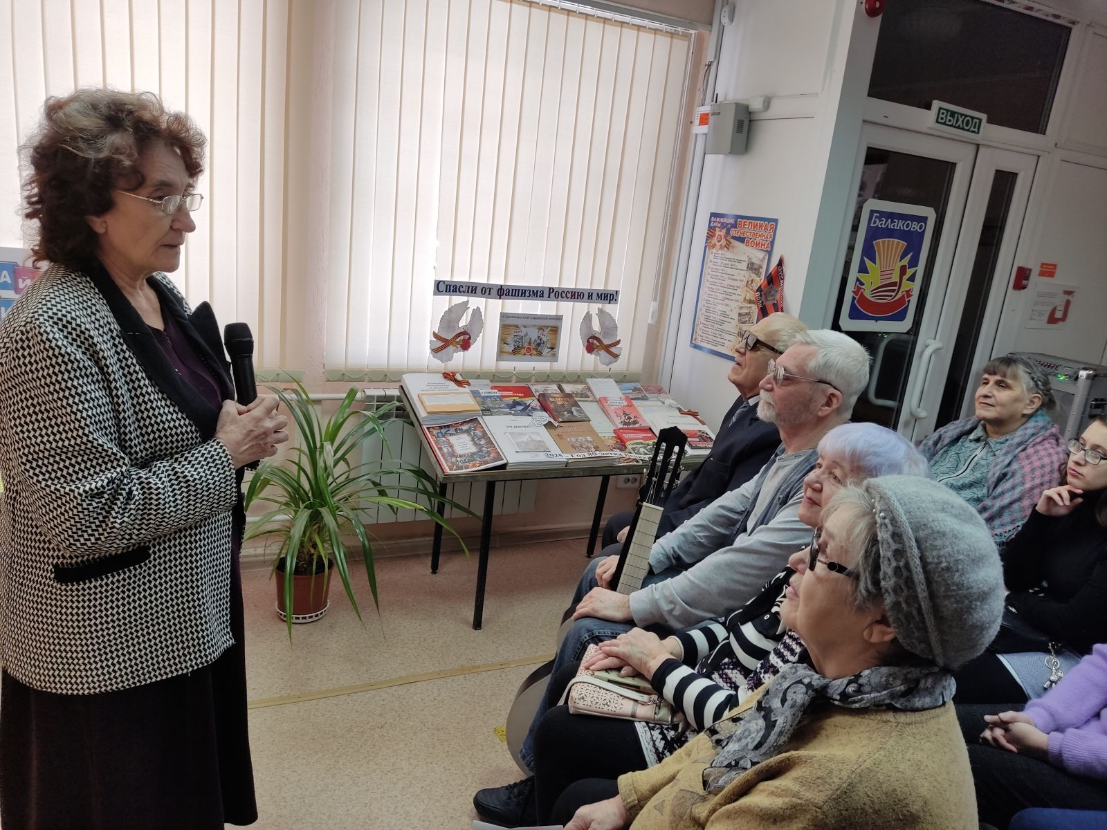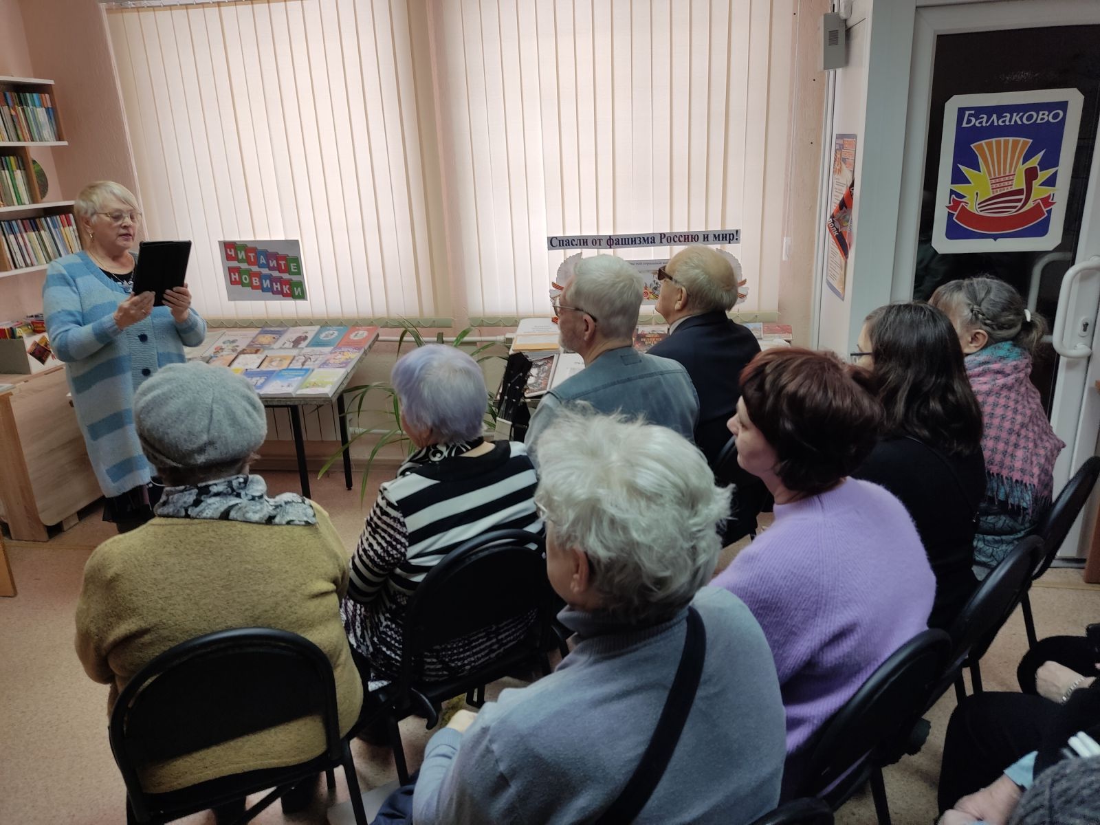 В Балаковском филиале в течение года работают книжно-иллюстративные выставки «Наш народ – великий воин! Славы предков будь достоин!» (в рамках Года защитника Отечества) и «Спасли от фашизма Россию и мир» (посвящённая 80-й годовщине Победы в Великой Отечественной войне 1941-1945 годов). Участникам мероприятия представили литературные произведения разных форматов и на разных носителях о великих героических страницах истории нашей страны, о защитниках Отечества; познакомили с произведениями о мужестве и самоотверженности русского народа, победившего в Великой Отечественной войне, в результате героической борьбы освободившего мир от фашизма, сохранившего независимость многих стран.