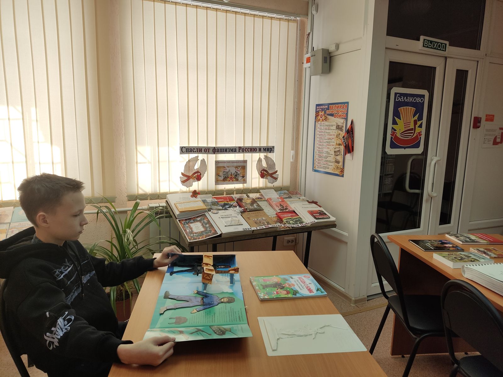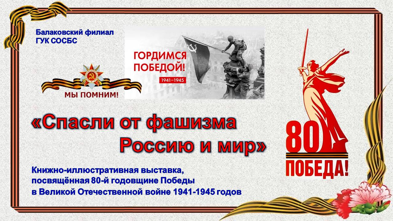 В Балаковском филиале Областной специальной библиотеки для слепых работает книжно-иллюстративная выставка, посвящённая 80-й годовщине Победы в Великой Отечественной войне 1941-1945 годов. Выставка «Спасли от фашизма Россию и мир» представляет художественную и научно-популярную литературу разных форматов и на разных носителях по сохранению исторической памяти о героизме защитников Отечества в Великой Отечественной войне, сокрушивших нацизм, по увековечиванию боевого и трудового подвига советского народа, отстоявшего свободу своей страны и многих стран мира в тяжёлые годы Второй мировой войны; содержит иллюстрации, аудиозаписи и видеоматериалы, посвящённые мужеству и самоотверженности русского народа, освободившего мир от фашизма.