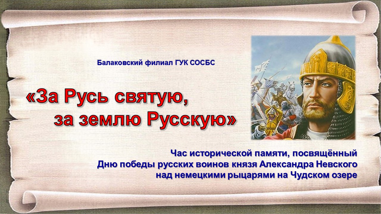 18 апреля в России отмечается День воинской славы – День победы русских воинов князя Александра Невского над немецкими рыцарями на Чудском озере (Ледовое побоище, 1242 год). Эта историческая победа остановила продвижение крестоносцев на восток – ливонцы отказались от притязаний на Новгород, Псков, Лугу и другие русские земли.