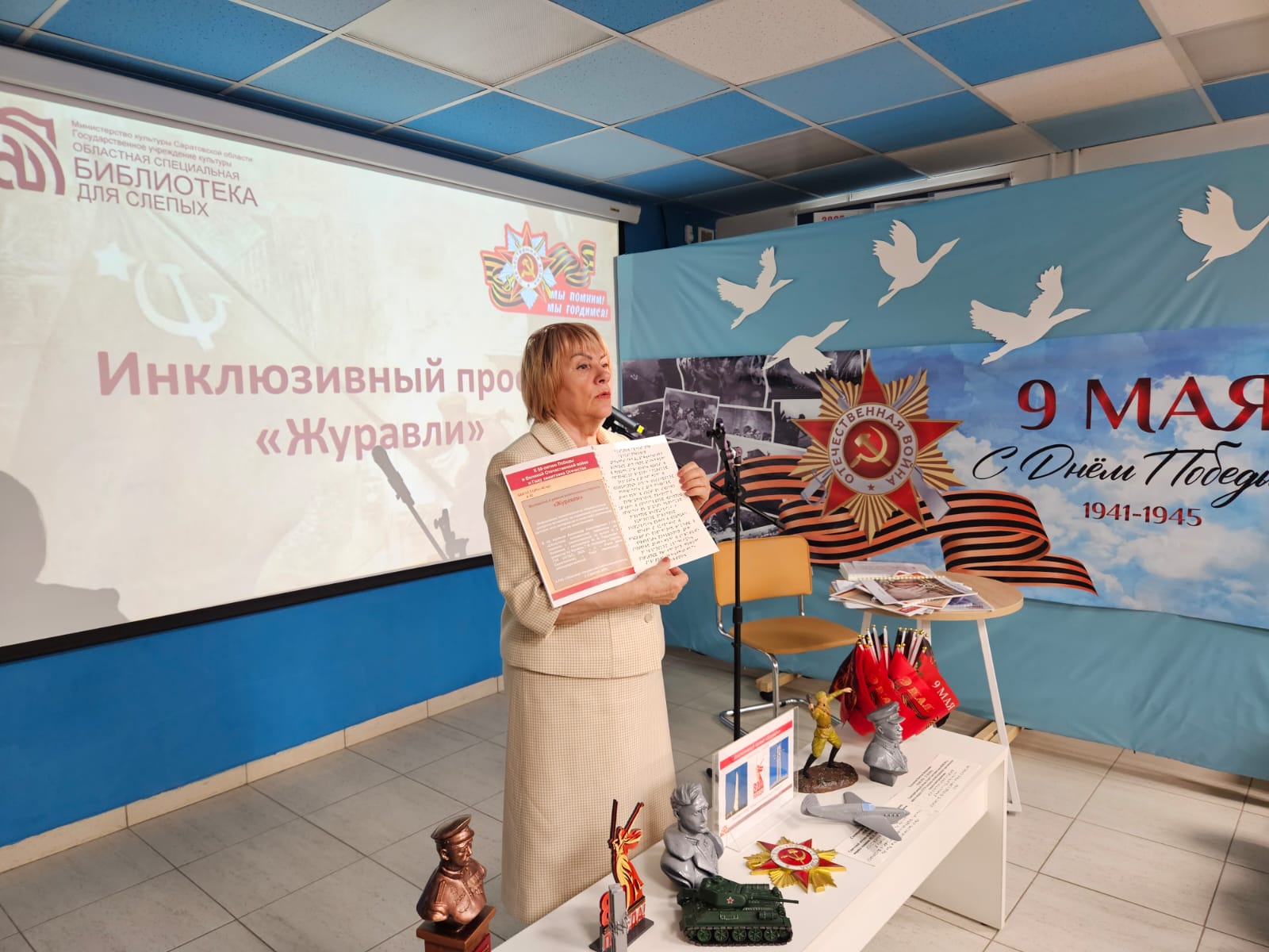 В год 80-летия Победы в Великой Отечественной войне и в Год защитника Отечества 30 апреля 2025 года открылся инклюзивный проект «Журавли» в целях сохранения памяти о подвигах наших земляков, жителей и защитников города-героя Севастополя в годы Великой Отечественной войны, и в честь наших бойцов, которые сейчас проводят специальную военную операцию. Организаторами выступили ГУК «Областная специальная библиотека для слепых» при поддержке Министерства культуры Саратовской области и ГБУК г. Севастополя «Региональная информационно-библиотечная система».