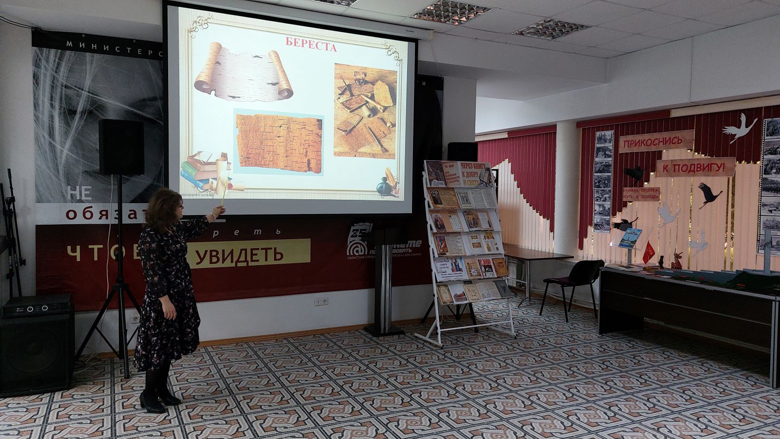 Вниманию посетителей был предложен обзор книжной выставки «Через книгу к добру и свету». Книги, представленные на выставке, рассказывают об истории письма и русской книжности. На выставке можно познакомиться с литературой, посвященной пословицам, поговоркам, фразеологизмам и истории их появления в языке, историческими энциклопедиями и актуальными современными словарями.