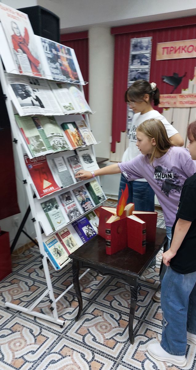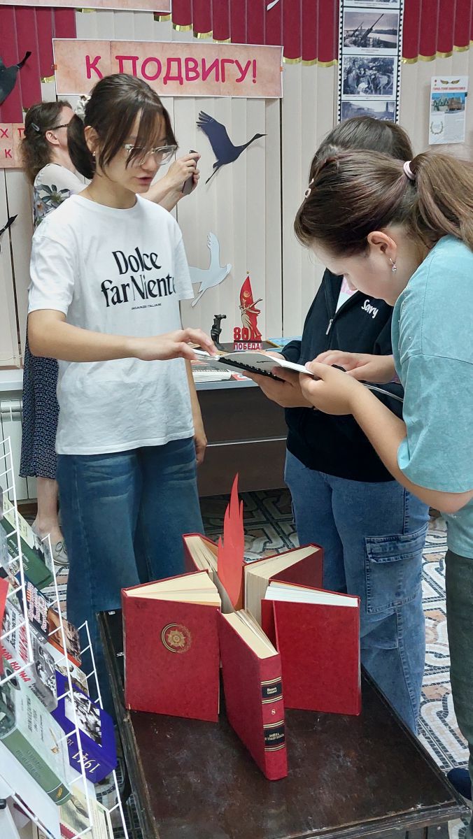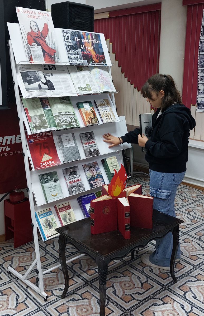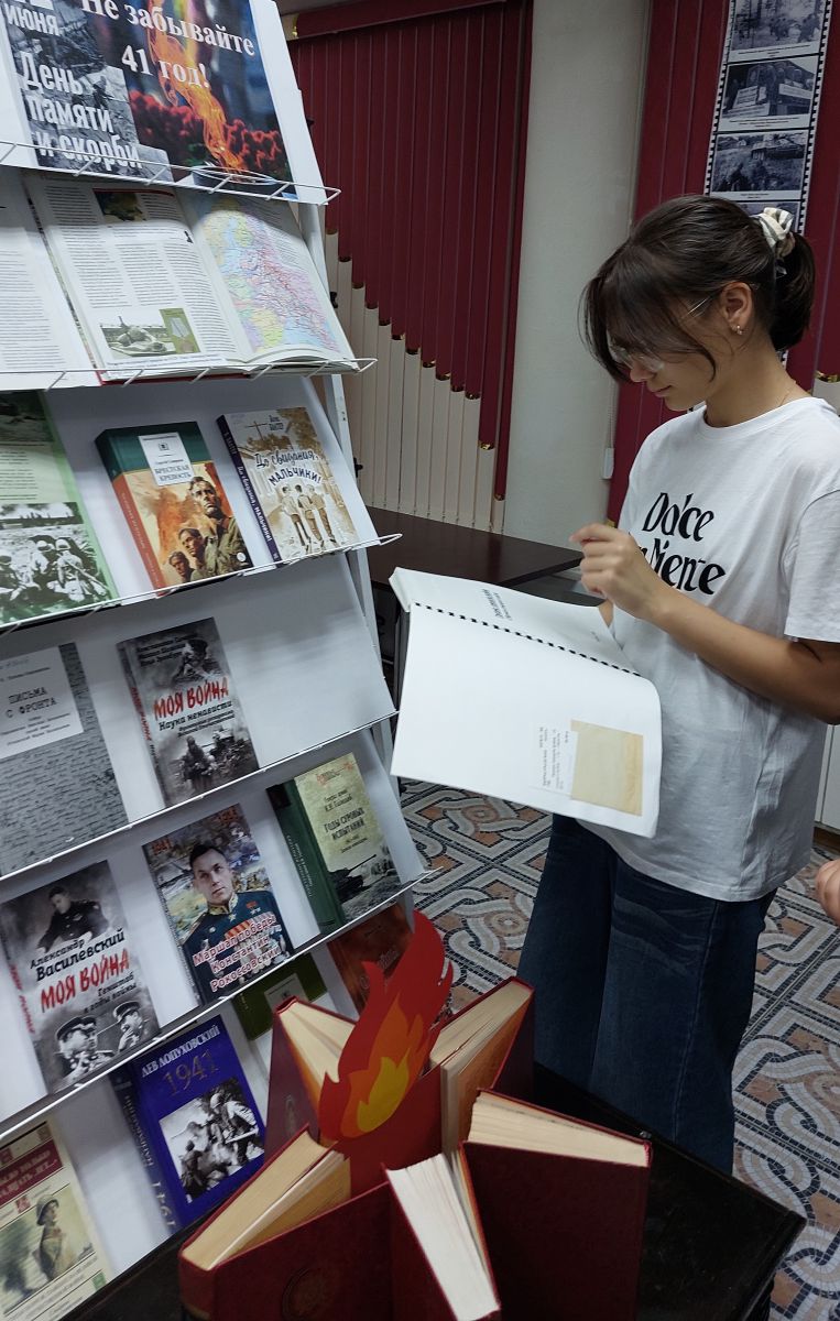 Большой интерес у школьников вызвала тематическая выставка-инсталляция «Не забывайте 41 год!», организованная к этому памятному дню. Дети очень внимательно рассматривали книги в специальных форматах. На выставке представлена художественная литература о начале Великой войны, о силе духа и подвигах наших солдат. Книги проиллюстрированы сотнями уникальных фотографий, помогающих чётко и ясно представить трагедию и подвиг 22 июня. Цель выставки – сохранить и приумножить память о подвиге народа в Великой Отечественной войне 1941-1945 годов, а также повысить уровень информированности читателей в области истории Великой Отечественной войны.