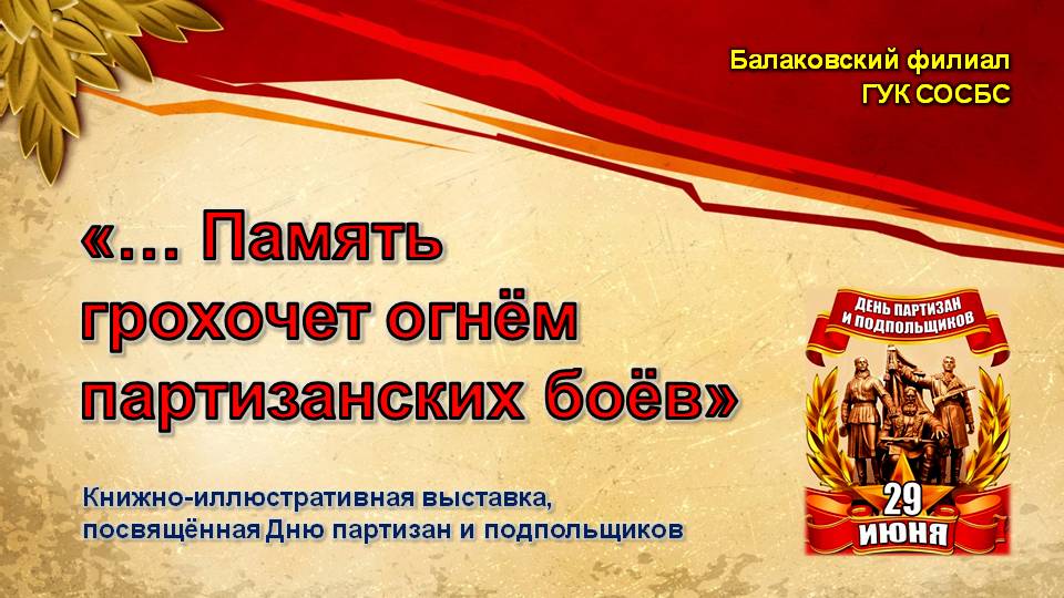 В Балаковском филиале Областной специальной библиотеки для слепых работает книжно-иллюстративная выставка «… Память грохочет огнём партизанских боёв», посвящённая Дню партизан и подпольщиков. Выставка рассказывает о дне воинской славы России, установленном в честь Дня партизан и подпольщиков, о возникновении памятной даты, знакомит с её историей и традициями; представляет литературно-художественную и научно-популярную литературу разных форматов и на разных носителях о самоотверженной партизанской борьбе в тылу немецко-фашистских войск, внесшей один из решающих вкладов в Великую Победу.