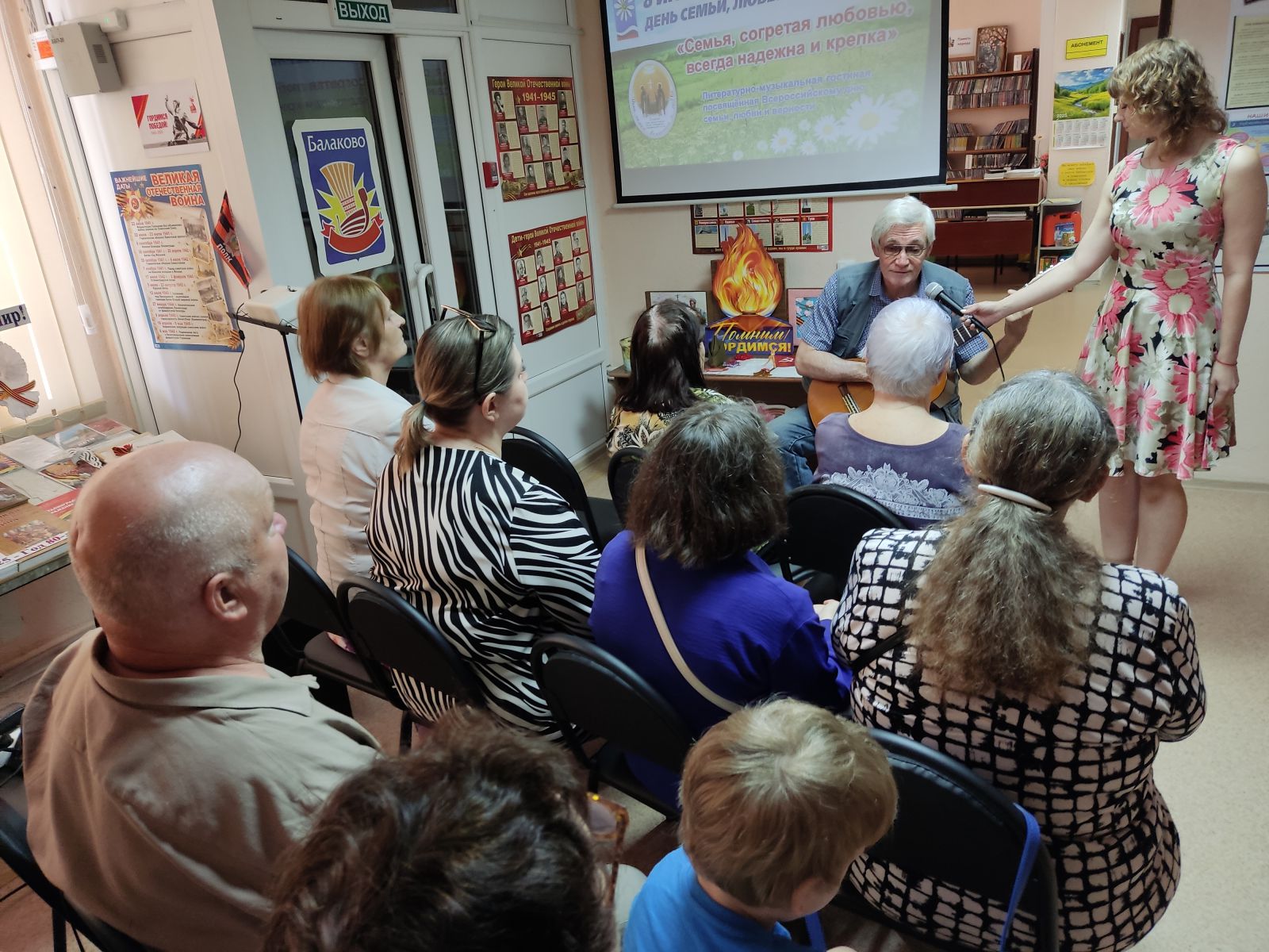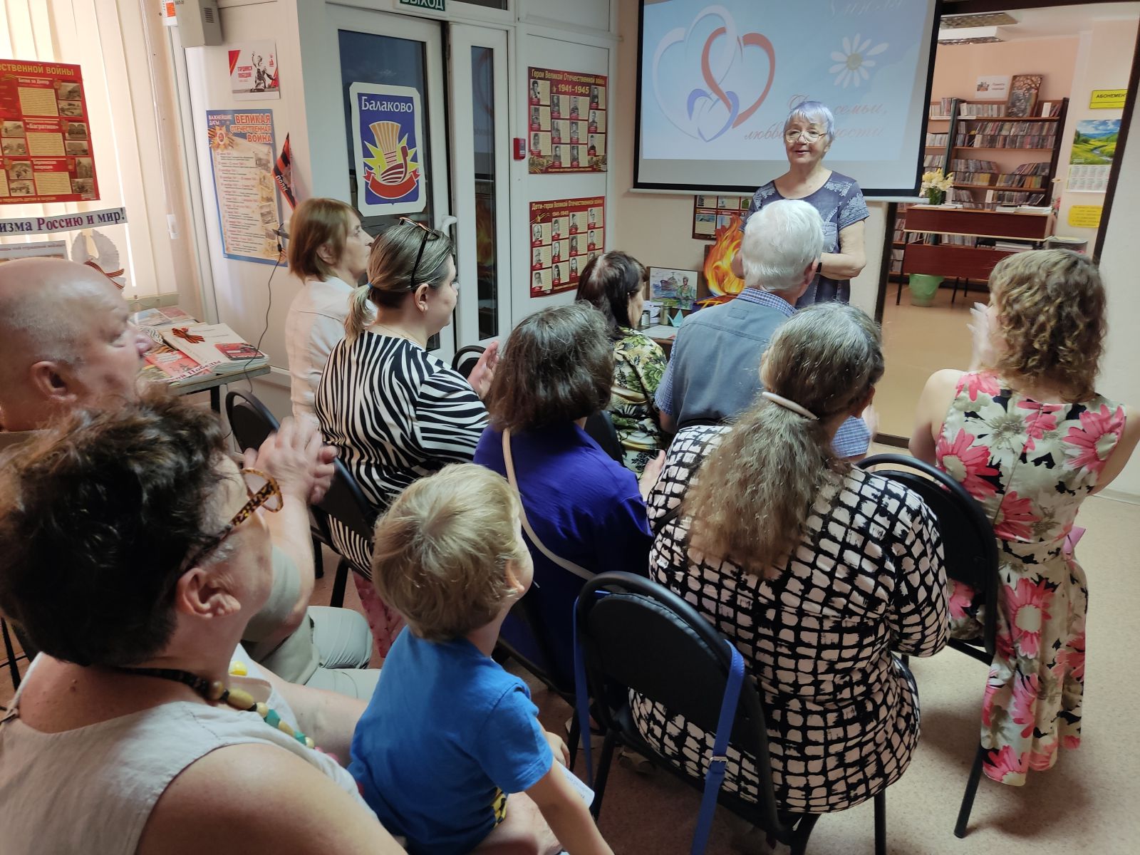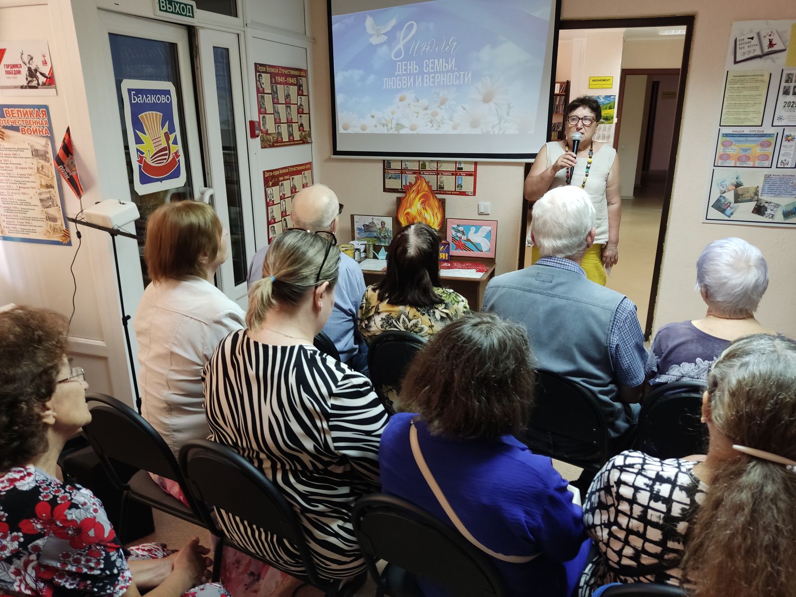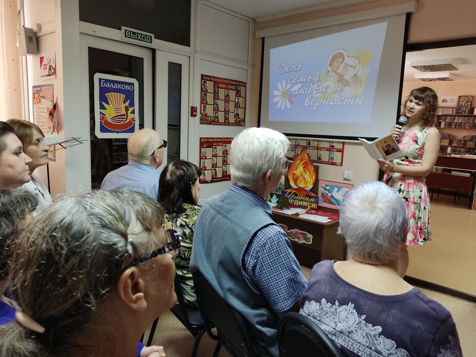 Балаковский филиал Областной специальной библиотеки для слепых подготовил для читателей литературно-музыкальную гостиную, посвящённую Дню семьи, любви и верности. Мероприятие «Семья, согретая любовью, всегда надёжна и крепка» рассказало о возникновении праздника, об истории русских православных святых Петра и Февронии, покровителей семьи и брака в православной традиции, о символе праздника; представило литературные и музыкальные произведения о семье и любви. Свободный микрофон предоставил возможность всем желающим поделиться интересными историями из своей жизни и творчеством: вокальным и чтением поэтических произведений.