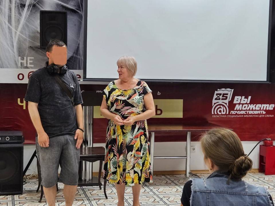 Директор Ольга Новикова ГУК «Областная специальная библиотека для слепых» и коллеги поблагодарили Владимира за его мужество и героизм, за защиту Родины, пожелали бойцу успехов, здоровья и быстрее вернуться домой после победы.