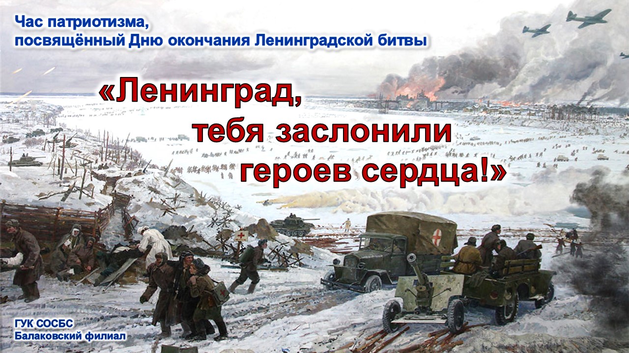 Балаковский филиал Областной специальной библиотеки для слепых подготовил для своих читателей час патриотизма, посвящённый Дню окончания Ленинградской битвы; сотрудники библиотеки рассказали о Дне воинской славы – дне окончания самой продолжительной в Великой Отечественной войне Ленинградской битвы, имевшей ключевое военно-стратегическое значение в ходе войны, о важнейших событиях обороны Ленинграда, о мужестве, стойкости и героизме жителей осаждённого города, о несломленном духе народа, о суровых условиях и тяжелейших испытаниях, через которые прошли ленинградцы, выжили, сохранили человеческое достоинство и победили.