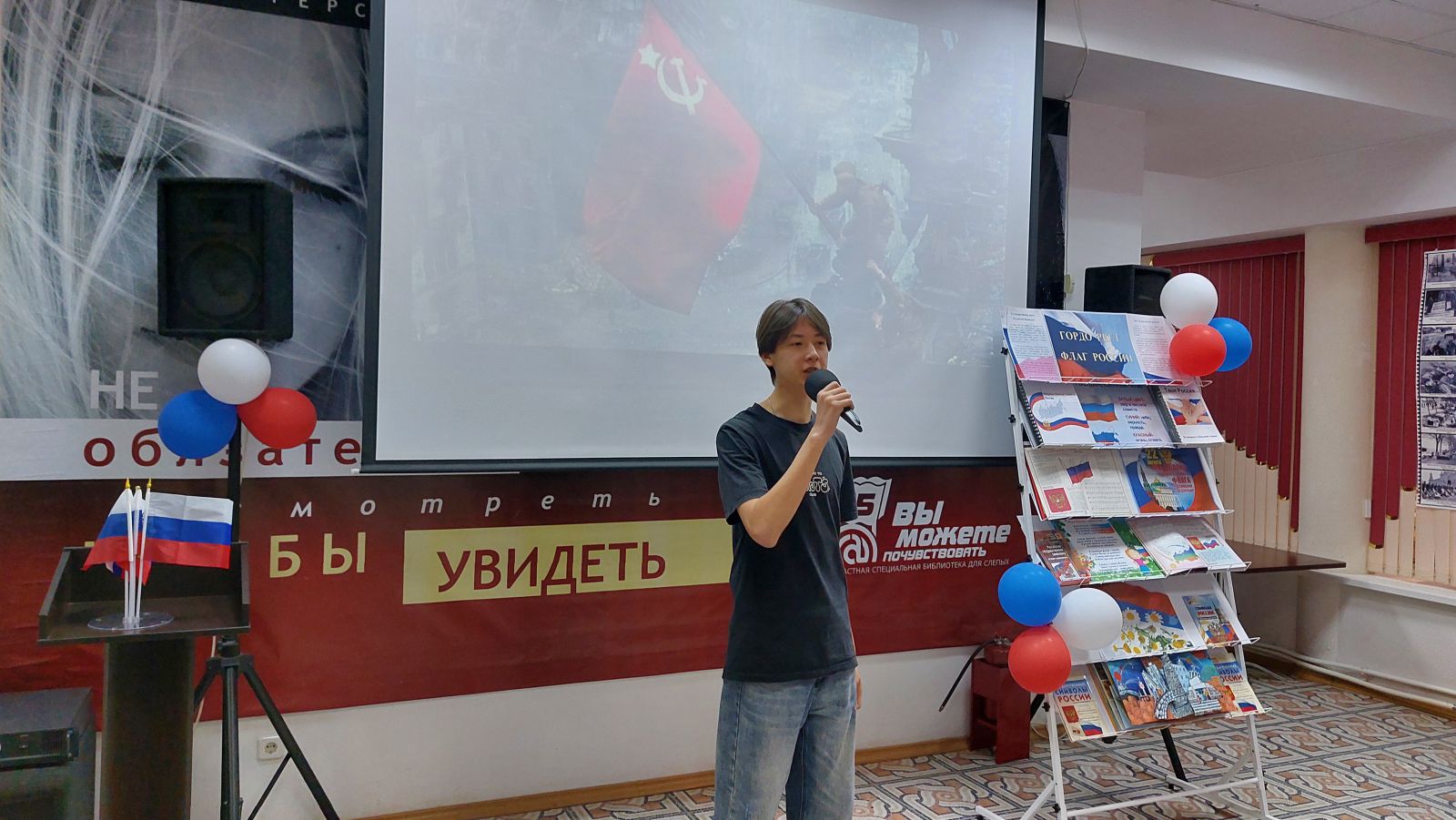 В празднично украшенном зале были представлены книжно-иллюстративные выставки, посвященные главному государственному символу. На выставке «Гордо реет флаг России» книги в разных форматах рассказывают о подвигах в годы Великой Отечественной войны 1941-1945 годов тех солдат, кто спасал боевые знамена. Выставка героям СВО «Время героев не проходит» рассказывает о наших земляках – участниках СВО, которые поднимают государственный стяг на освобожденных территориях.