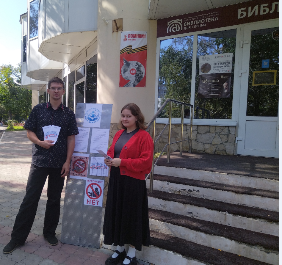 Сотрудники центра социально-значимой и правовой информации ГУК «Областная специальная библиотека для слепых» провели акцию «Внимание! ТЕРРОР!». В около библиотечном пространстве библиотекари рассказали посетителям Детского парка о правилах поведения при угрозе терроризма и раздали им информационные буклеты, содержащие наглядные примеры используемых украинскими вербовщиками методов вовлечения в террористическую деятельность, а также степени ответственности и неотвратимости наказания за участие в ней.