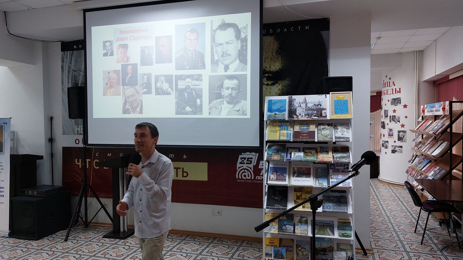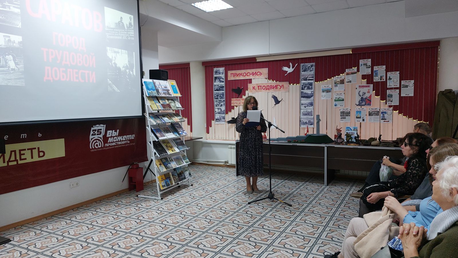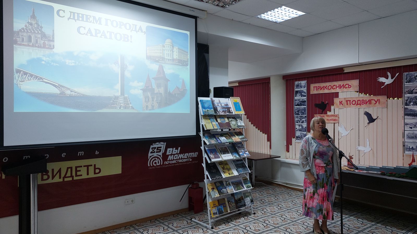 Читатели и гости библиотеки окунулись в историю города в годы Великой Отечественной войны 1941-1945 годов. Во время войны в Саратове были развернуты оборонные предприятия и военные госпитали, а заводы, работавшие в круглосуточном режиме, не прекращали производство ни на минуту. Весь город, от мала до велика, трудился на Победу. 2 июля 2020 года Саратову указом Президента Российской Федерации Владимира Путина было присвоено почётное звание «Город трудовой доблести». Это звание присвоено в знак признания выдающегося вклада жителей города в достижение Победы в Великой Отечественной войне 1941-1945 годов, которые бесперебойно обеспечивали фронт производством военной и гражданской продукции на промышленных предприятиях, поставляя на фронт самолеты, танки, боеприпасы и хлеб.