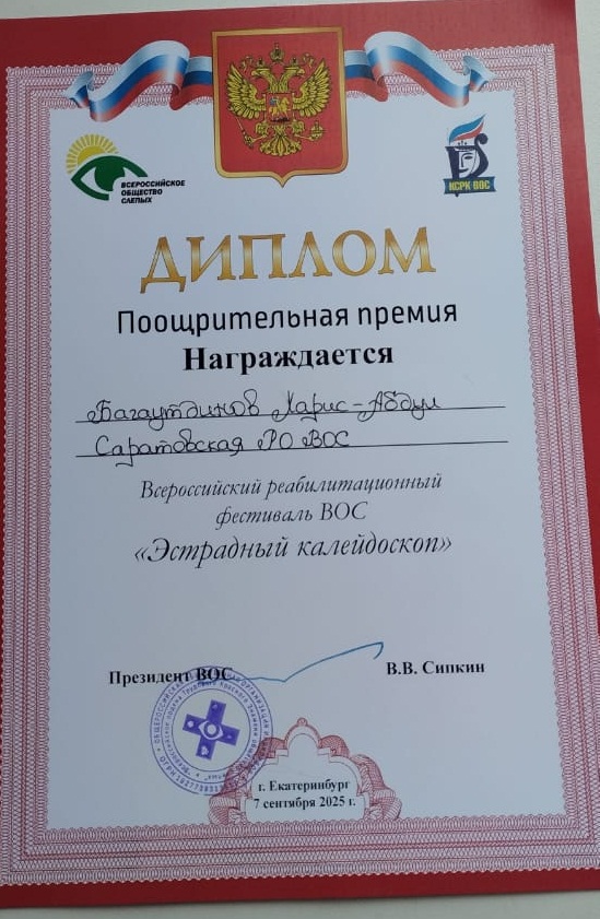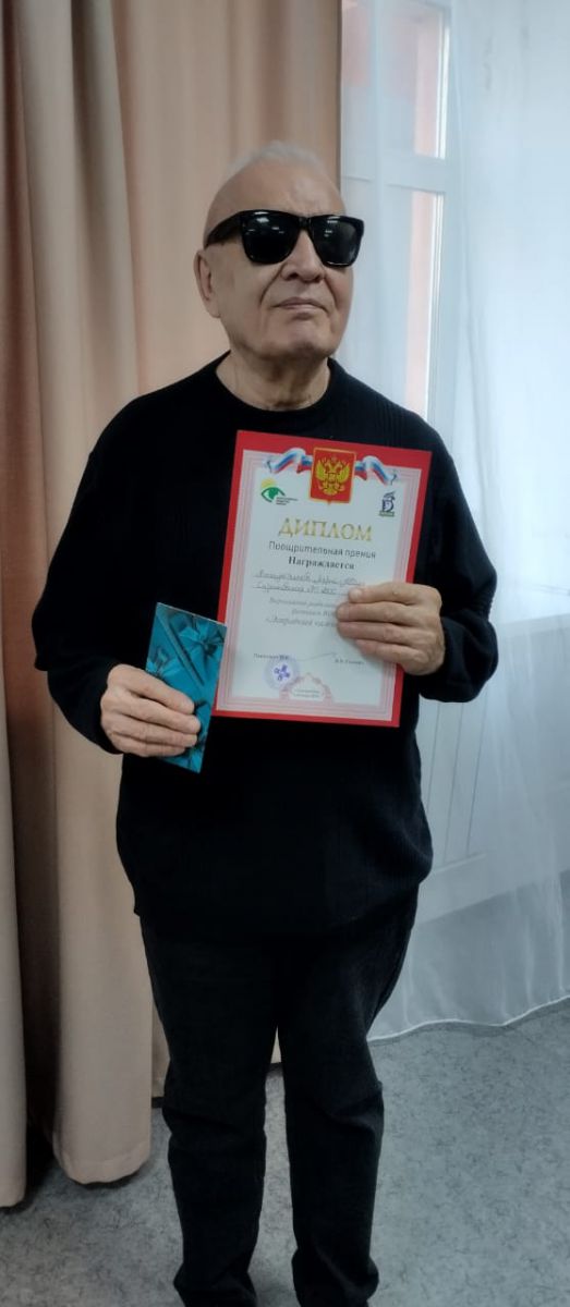 Харис Багаутдинов – читатель ГУК «Областная специальная библиотека для слепых» из города Балашова – принял участие во Всероссийском фестивале творчества инвалидов по зрению «Эстрадный калейдоскоп – 2025», представляя Саратовскую область. Финал фестиваля состоялся в городе Екатеринбурге. Более пятидесяти исполнителей поделились своим талантом. Это был настоящий праздник песни и дружбы! Наш номинант – самый старший участник финала, достойно выступил, исполнив две песни: «Письмо погибшего солдата» и «Это наша Россия», и получил специальный Диплом «Поощрительная премия»! Поздравляем и гордимся!!! Спасибо всем, кто нас поддерживал!