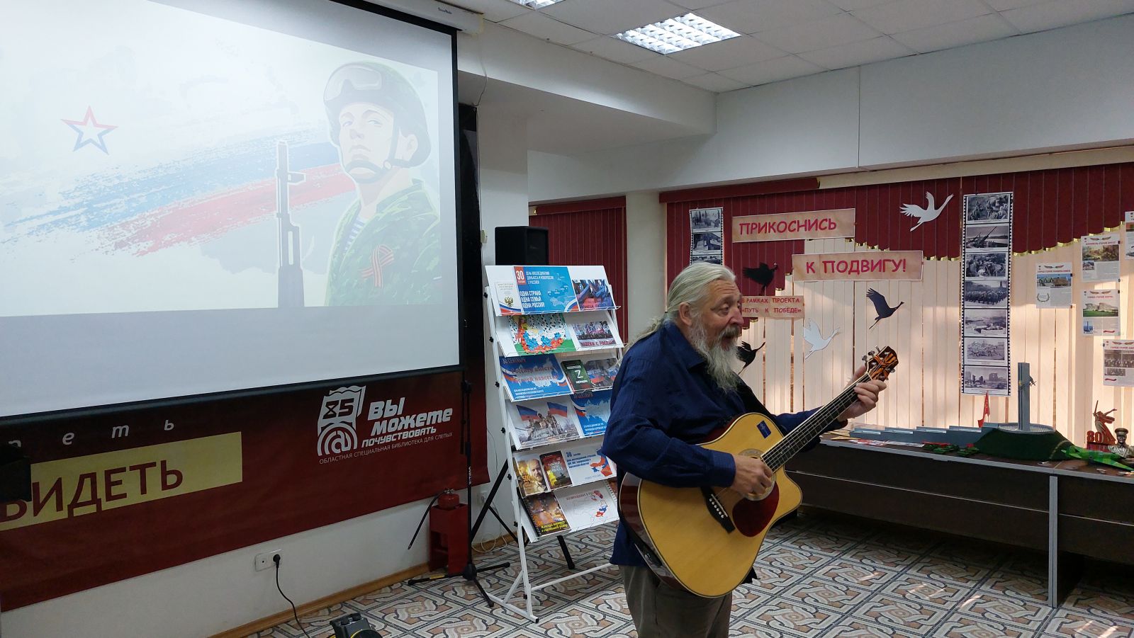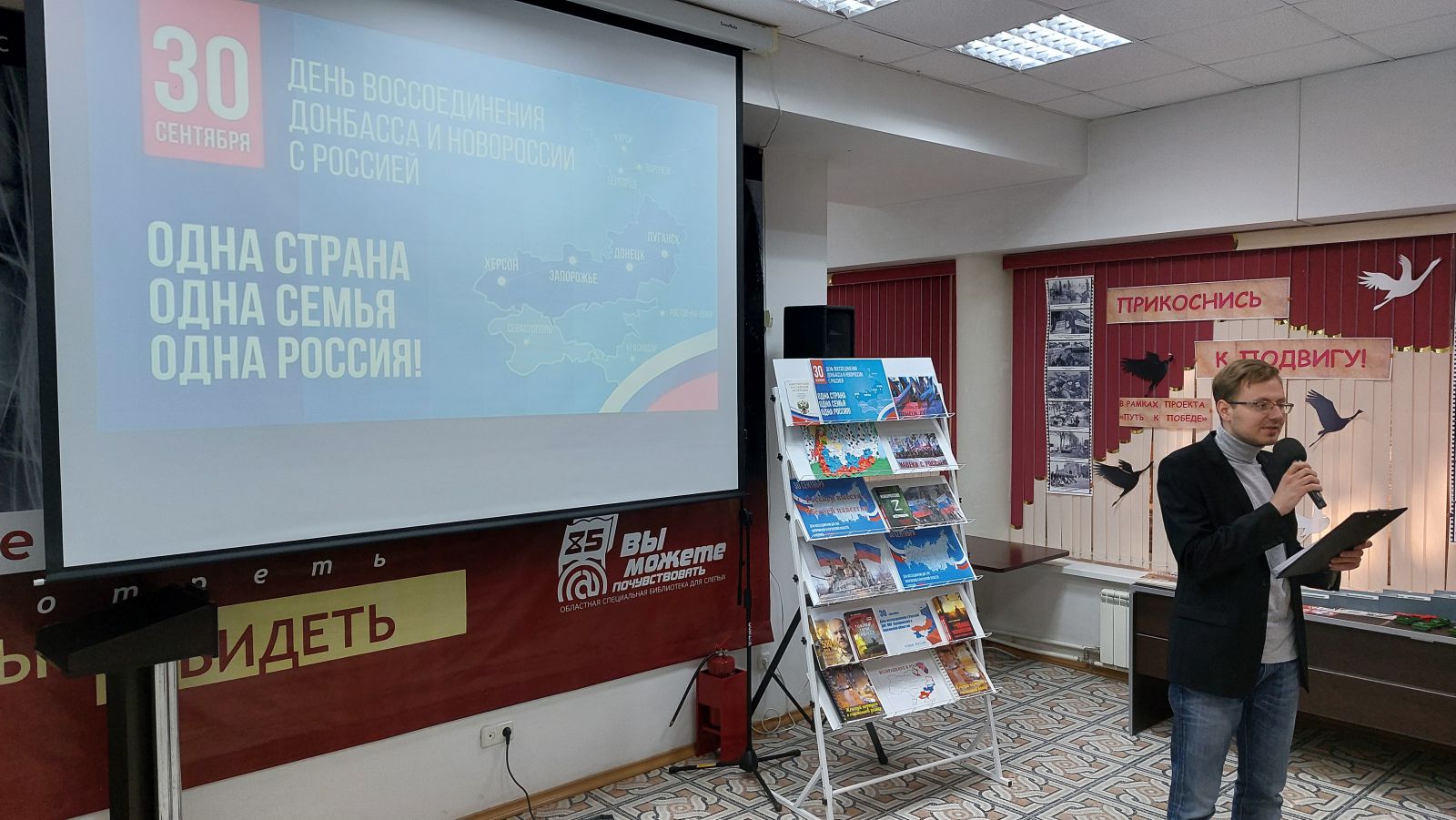 В ГУК «Областная специальная библиотека для слепых» прошло патриотическо-просветительское мероприятие «Под флагом России». В зале была представлена тематическая выставка «Одна страна. Одна семья. Одна Россия», выставки «Время героев не проходит…», «Прикоснись к подвигу!».
