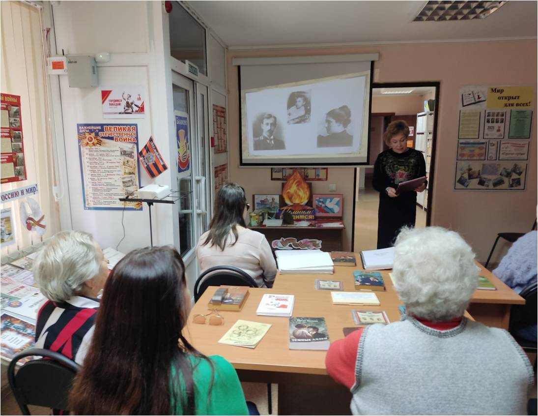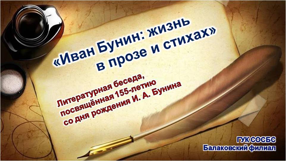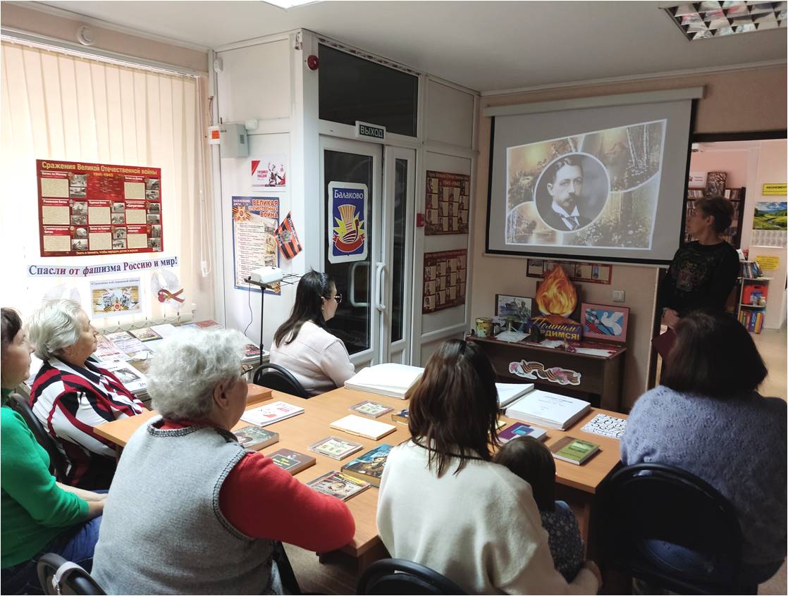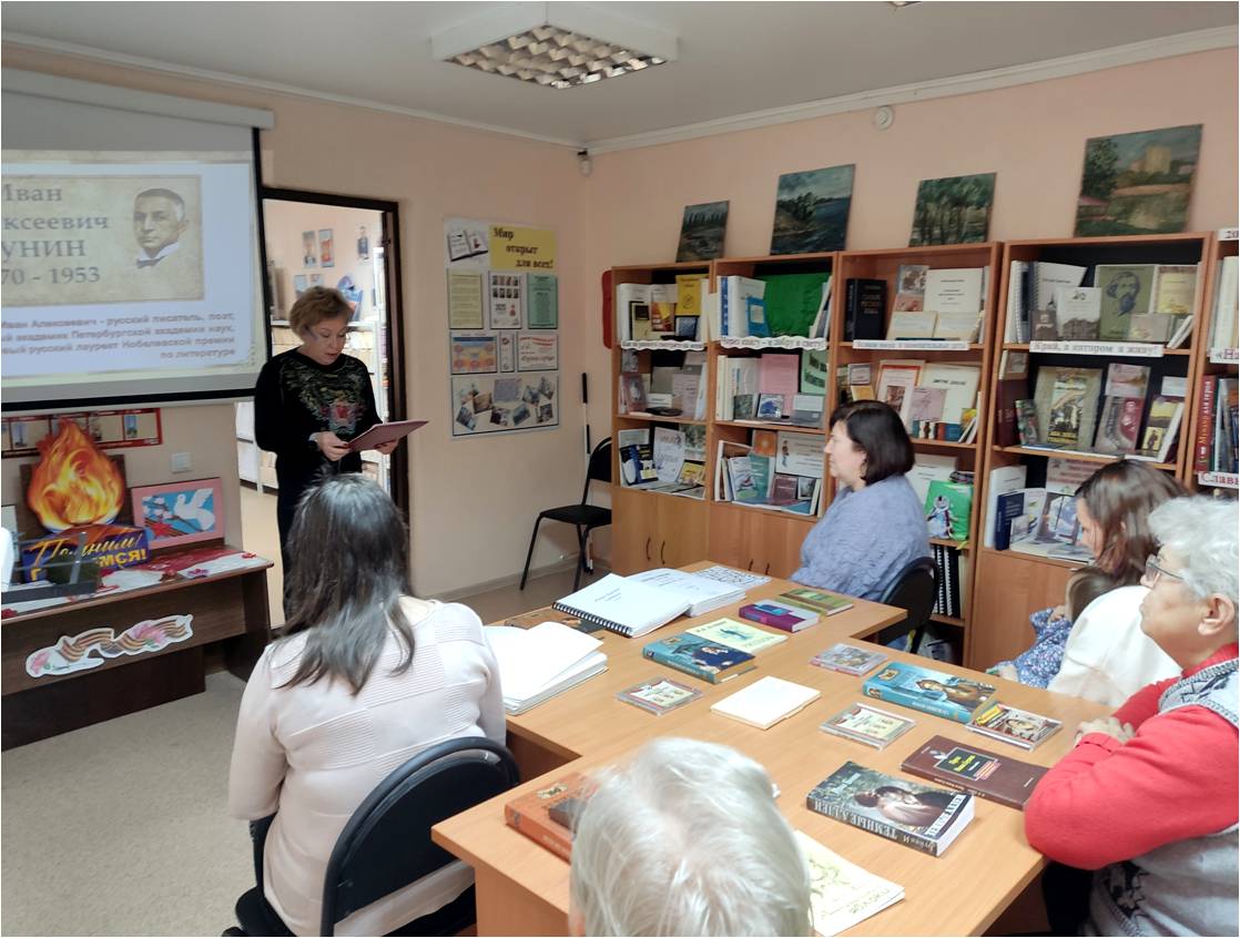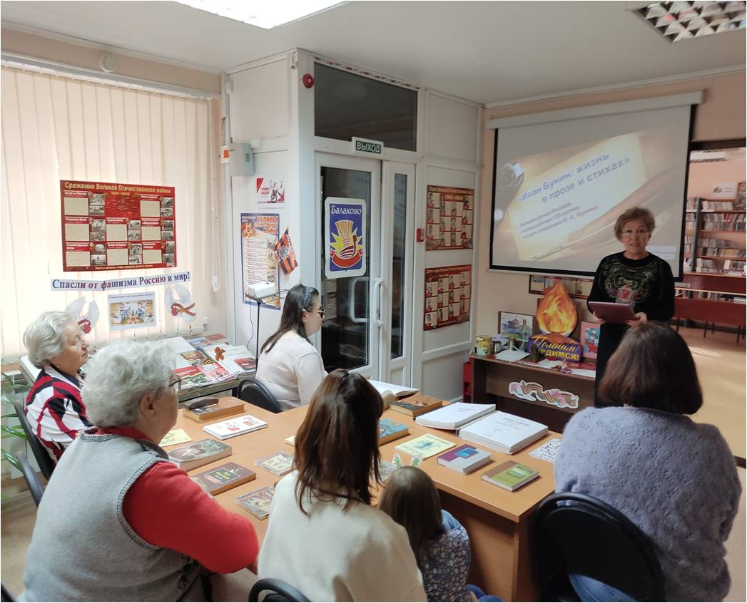 Балаковский филиал Областной специальной библиотеки для слепых подготовил литературную беседу, посвящённую 155-летию со дня рождения И.А. Бунина. Мероприятие «Иван Бунин: жизнь в прозе и стихах» рассказало о жизни и творчестве крупнейшего прозаика и поэта XX века, яркого представителя «серебряного века» русской культуры Ивана Алексеевича Бунина; познакомило с произведениями выдающегося мастера русской прозы и поэзии. Аудиозаписи и видеоматериалы позволили увидеть Ивана Бунина на кадрах кинохроники, услышать стихи в его исполнении; участники мероприятии прочитали любимые произведения Ивана Бунина.