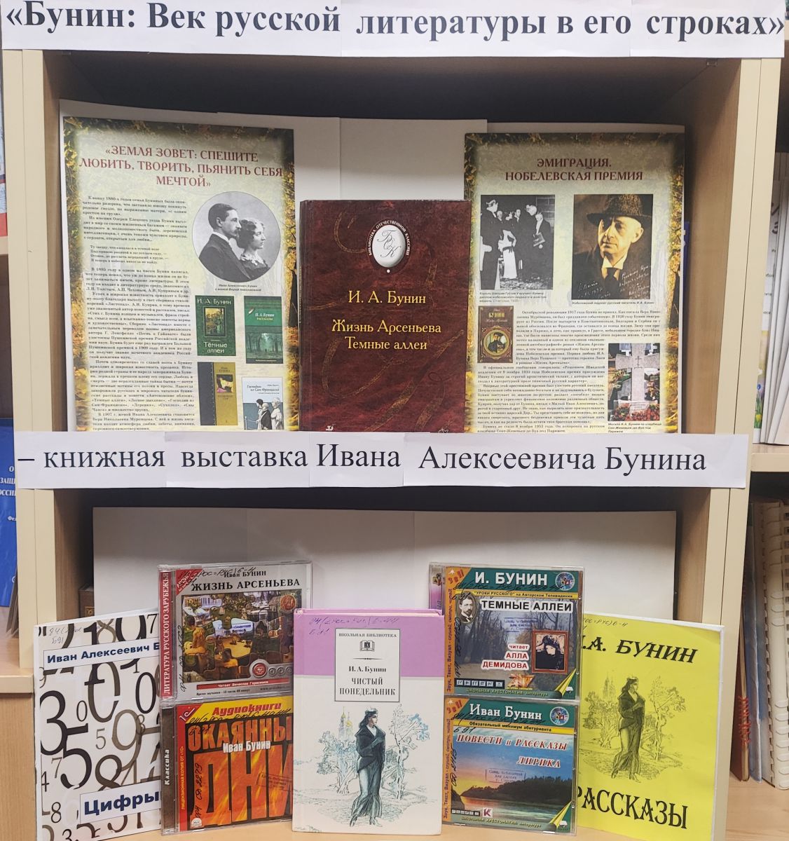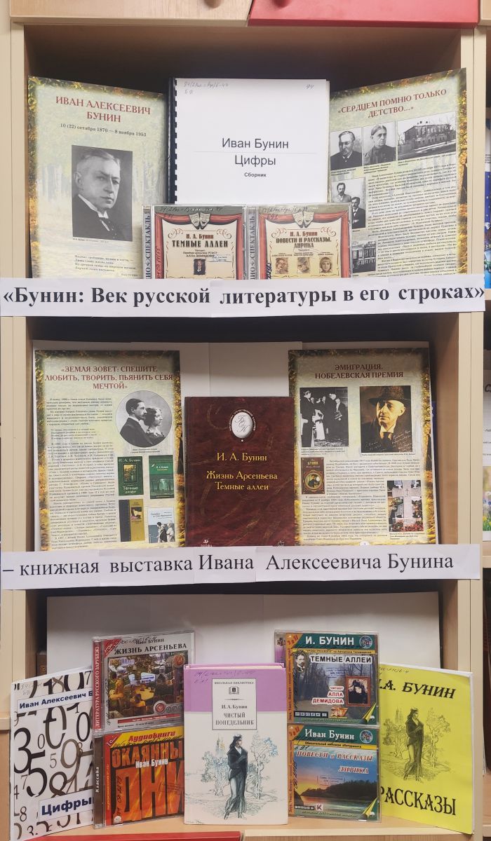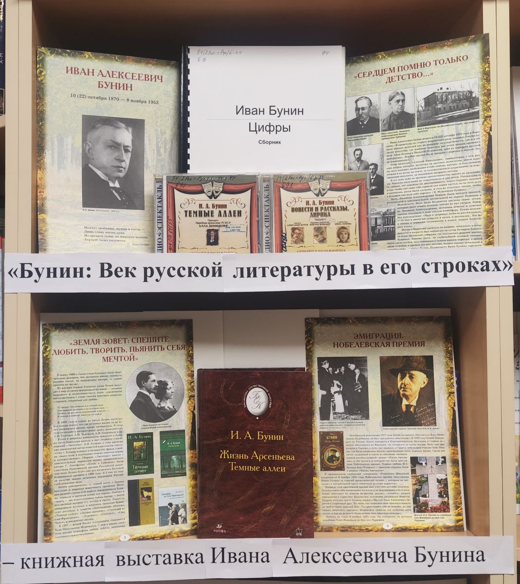 В этом году отмечается 155-летие со дня рождения Ивана Алексеевича Бунина, великого русского писателя и драматурга. В честь этого события в детско-юношеском секторе центра адаптивного чтения работает книжная выставка «Бунин: Век русской литературы в его строках». На выставке представлены произведения писателя в разных форматах и биографические материалы.