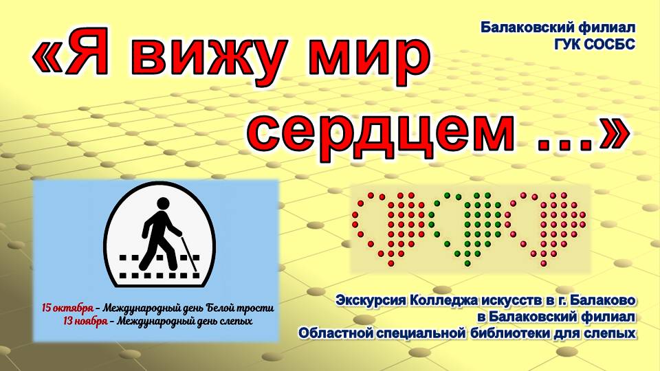 Балаковский филиал Областной специальной библиотеки для слепых пригласил в рамках месячника «Белая трость» учащихся «СОКИ» в г. Балаково на экскурсию по библиотеке. Студенты познакомились с библиотекой для слепых и её особенностями, с многообразием видов передачи информации для незрячих и слабовидящих читателей: книг, напечатанных рельефно-точечным шрифтом Брайля и укрупнённым шрифтом; «говорящих» книг на компакт-дисках и флешкартах; рельефно-графических пособий, тактильных книг, нот и обозначений на различных предметах шрифтом Брайля.