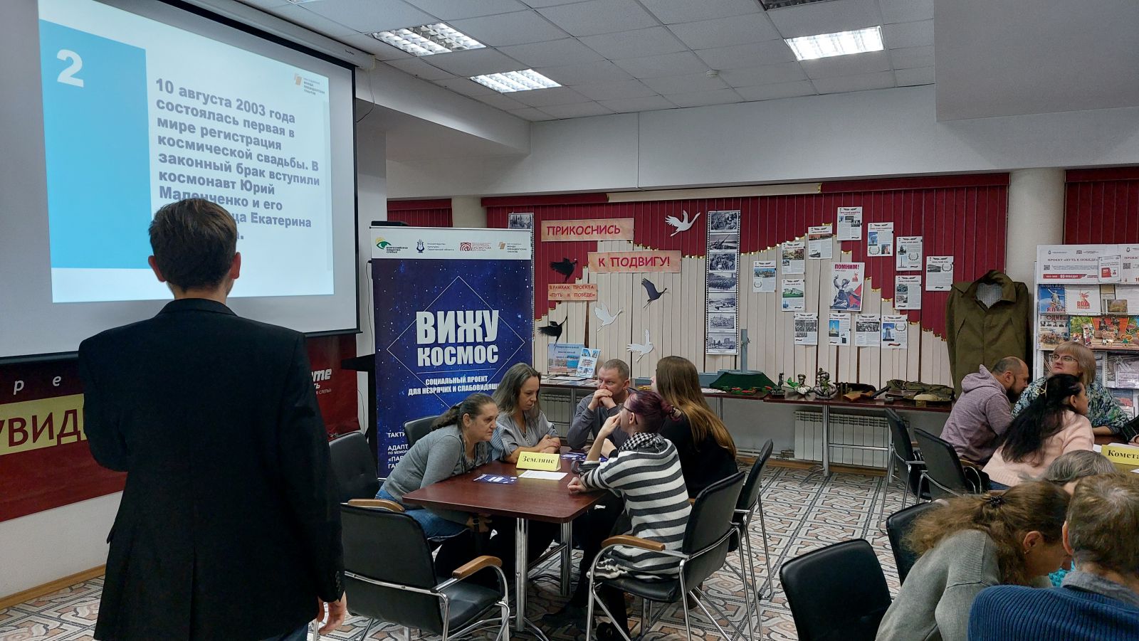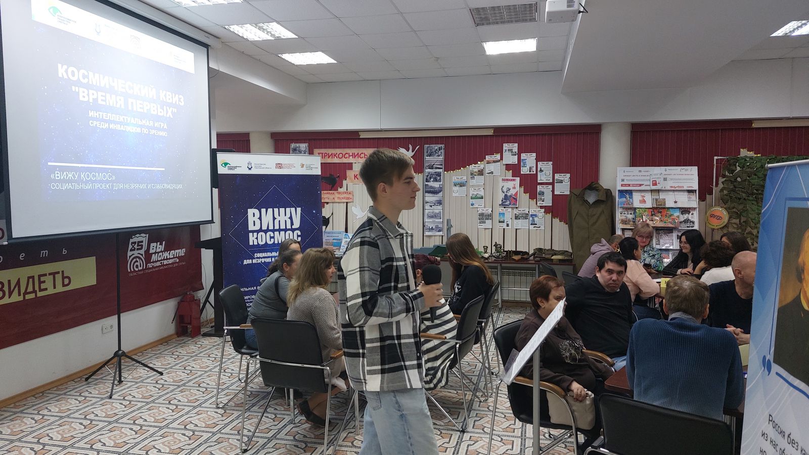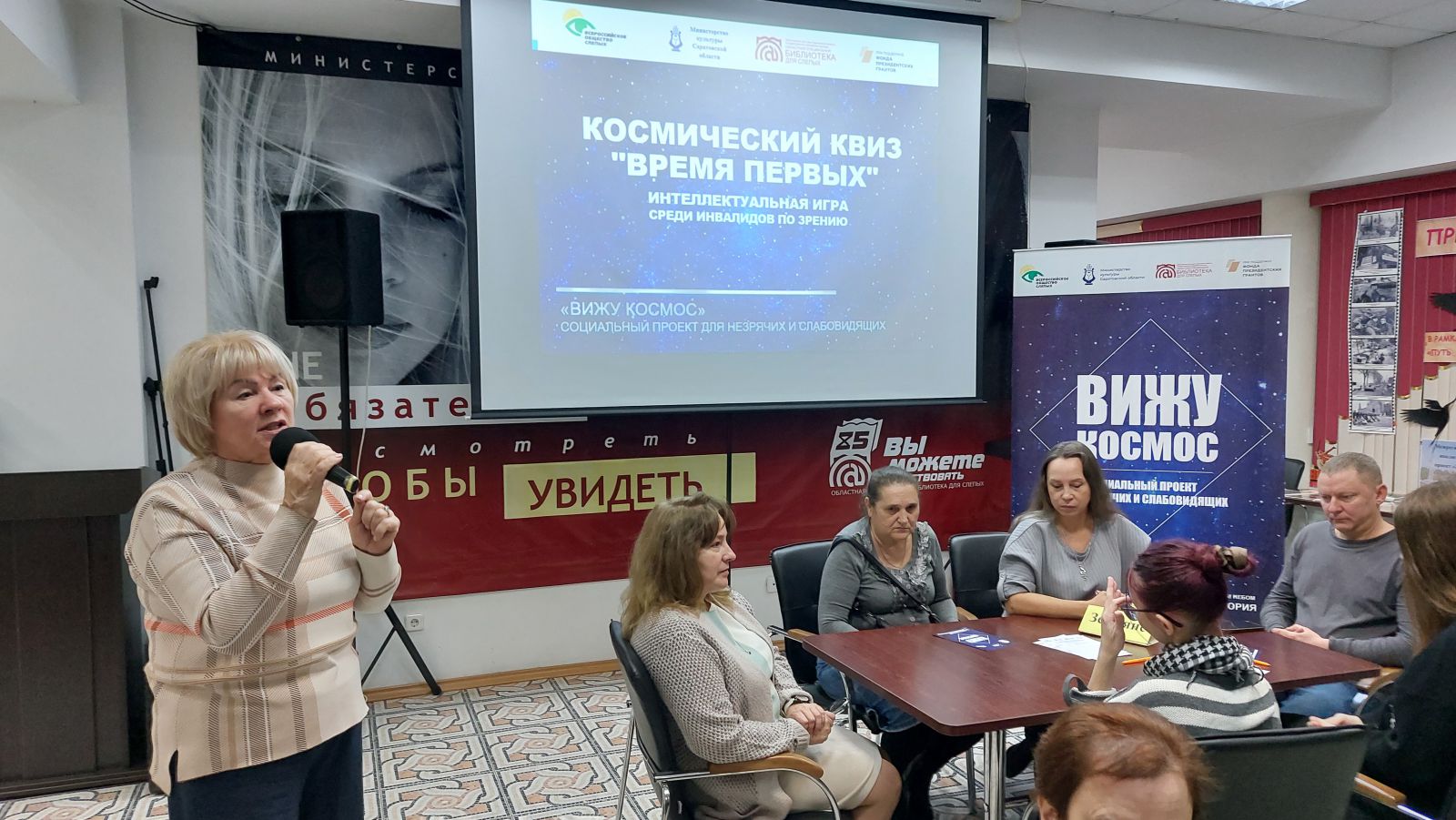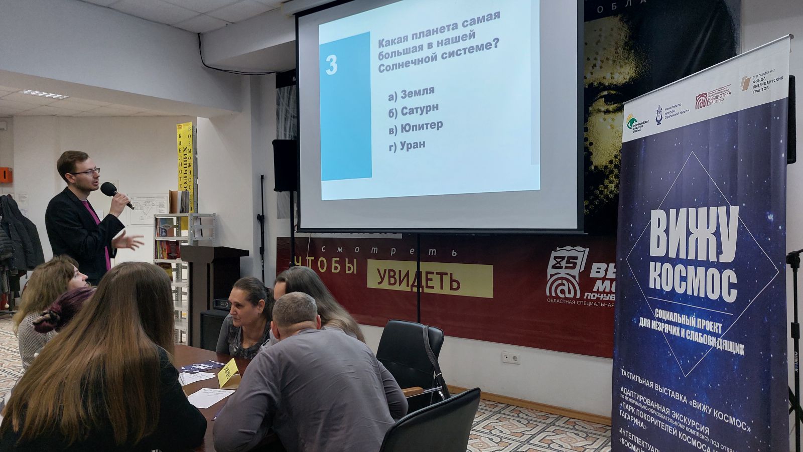 17 ноября в стенах ГУК «Областная специальная библиотека для слепых» царила атмосфера настоящего космического азарта! В рамках социального проекта для незрячих и слабовидящих «Вижу космос» при поддержке Фонда президентских грантов прошла увлекательная интеллектуальная игра под названием «Космический квиз "Время первых"», которая позволила участникам отправиться в захватывающее путешествие по просторам Вселенной, не покидая уютных залов библиотеки.