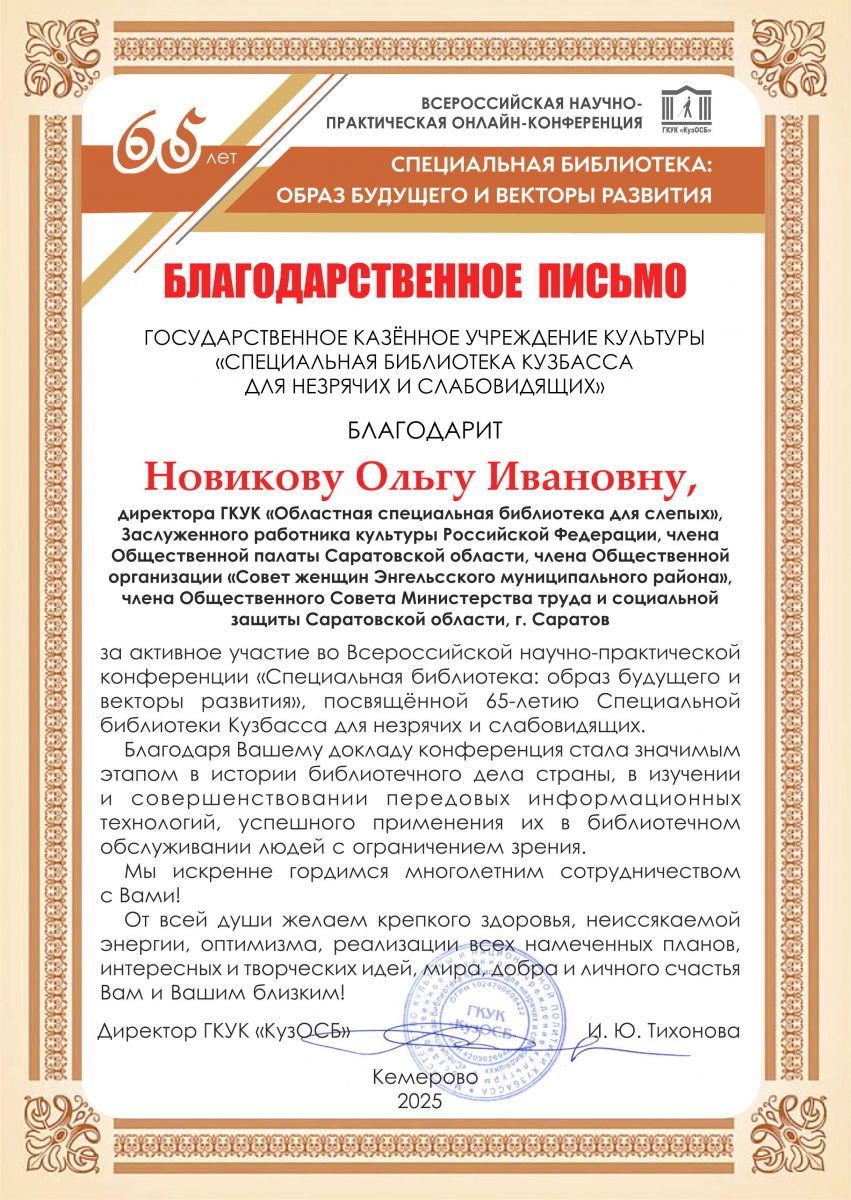 В декабре Ольга Ивановна также приняла участие во Всероссийской научно-практической онлайн-конференции «Специальная библиотека: образ будущего и векторы развития» (г. Кемерово), где я выступила с докладом «Специальная библиотека – инклюзивное пространство для творческого развития и диалога», получила благодарственное письмо от ГКУК «Специальная библиотека Кузбасса для незрячих и слабовидящих».