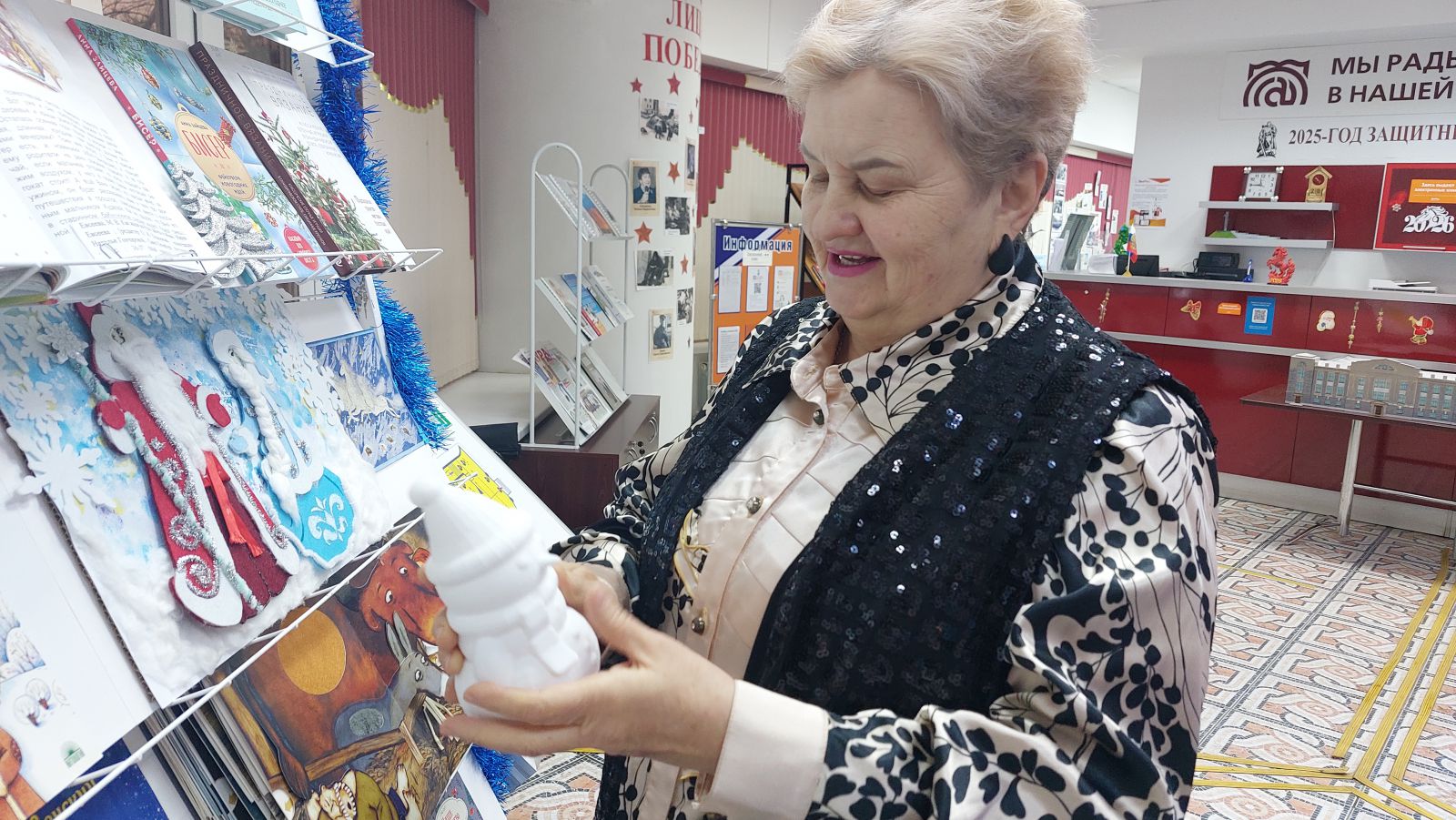 В нарядном холле читателей встречают атрибуты наступающего нового года: ёлочка, сверкающая гирляндами, и символ года – огненная лошадь.
