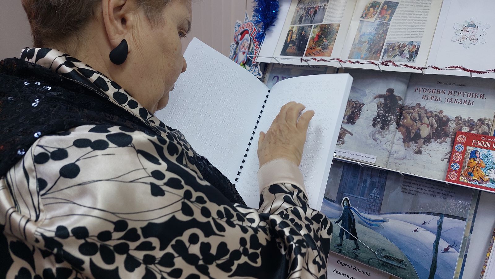 Среди них книги, изданные рельефно-точечным шрифтом Брайля: «Зимний дуб: сборник рассказов» Юрия Нагибина, «Зима: альманах для школьников», Саша Чёрный «Серебряная ёлка», «Зимняя девочка: рассказы и повесть» Сергея Иванова.