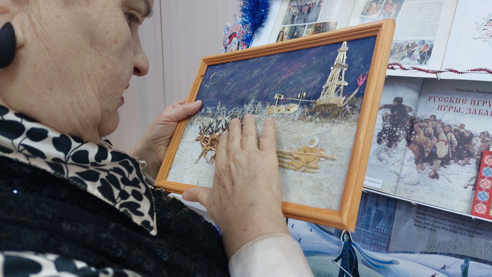 Для большего погружения в мир чудес и волшебства, выставка дополнена тактильными экспонатами. Необязательно покупать готовые фигуры Деда Мороза и Снегурочки на Новый год – их можно изготовить и самостоятельно из подручных материалов. Новогодняя тактильная аппликация яркое украшение выставки.