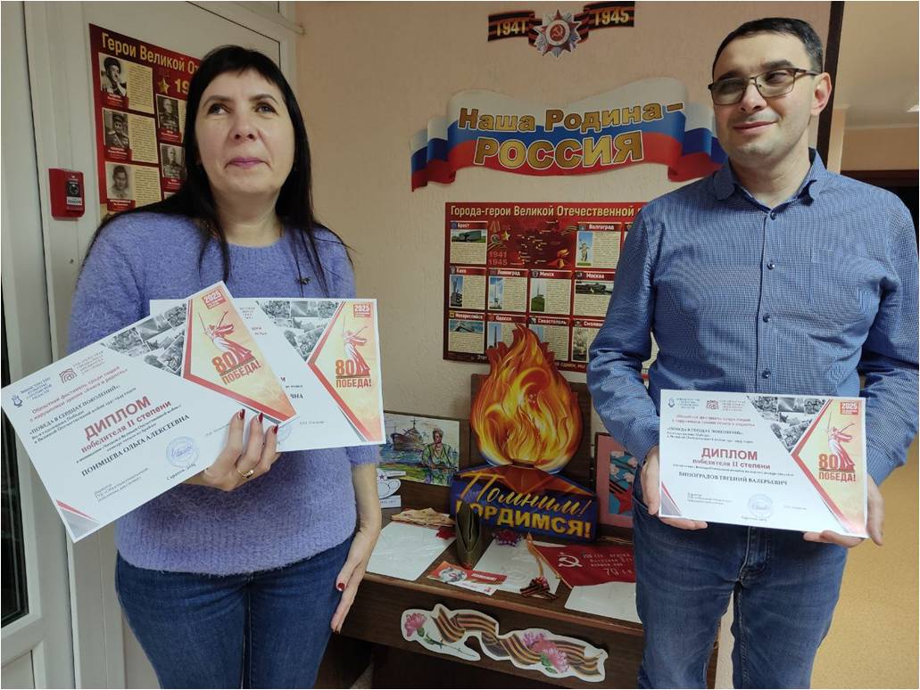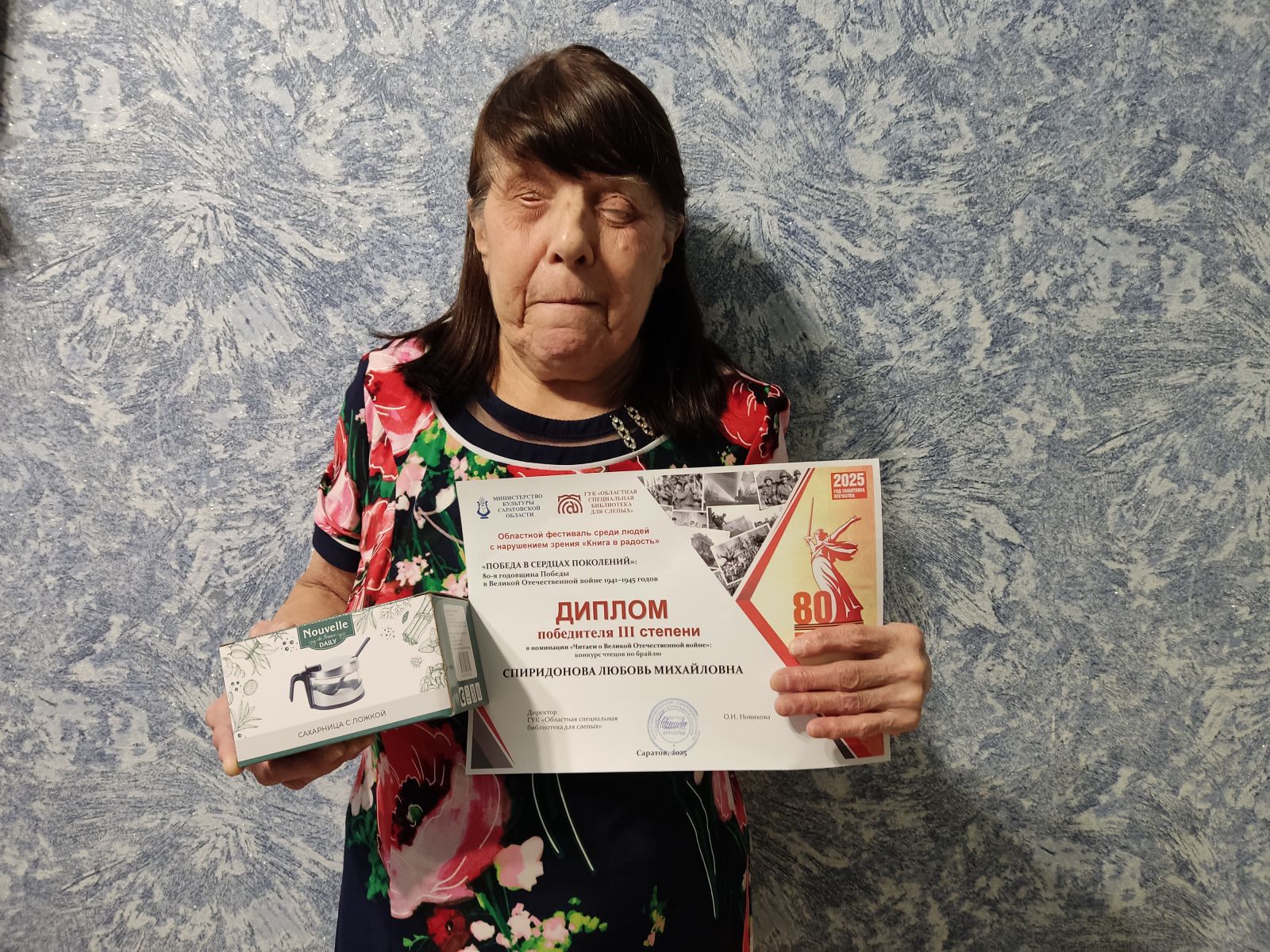 Читателям Балаковского филиала Областной специальной библиотеки для слепых вручили дипломы победителей Областного фестиваля среди людей с нарушением зрения, посвящённого 80-й годовщине Победы в Великой Отечественной войне 1941-1945 годов. Тема Фестиваля – «Победа в сердцах поколений». К участию в Фестивале, стартовавшему в начале 2025 года, были приглашены незрячие и слабовидящие читатели ГУК «Областная специальная библиотека для слепых», её филиалов и муниципальных библиотек, обслуживающих людей с нарушениями здоровья, проживающие на территории Саратовской области.