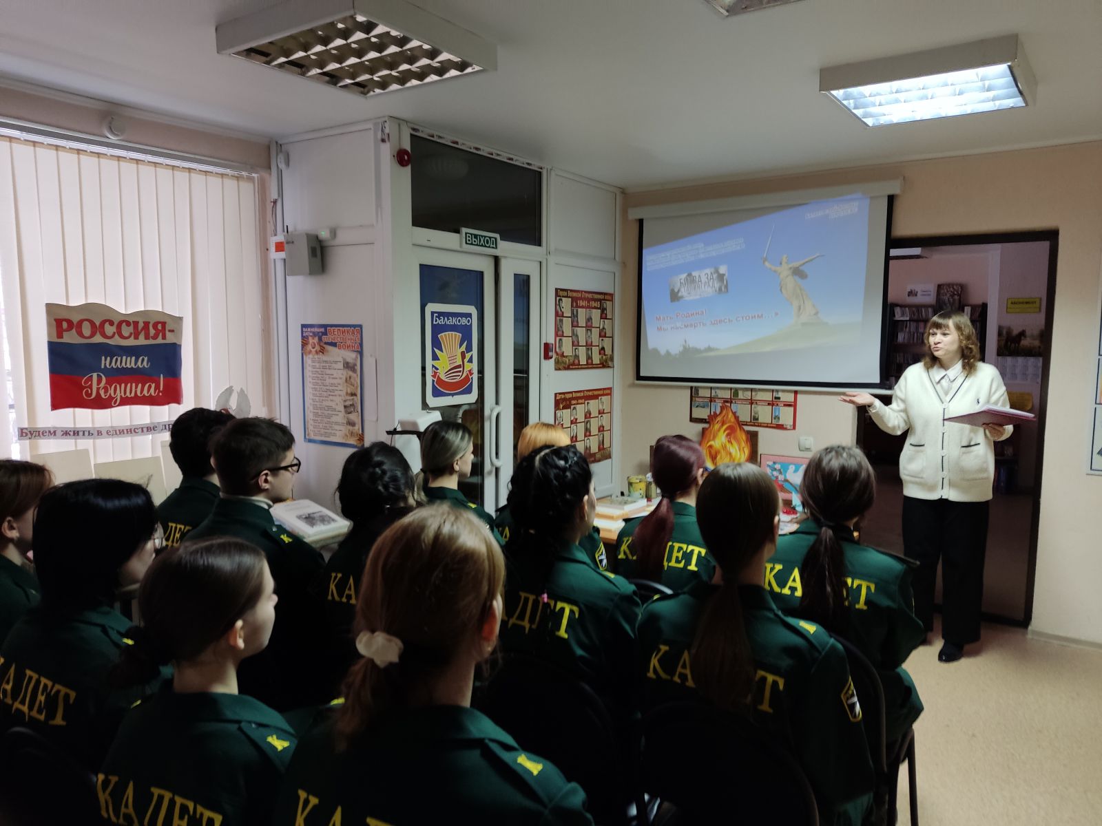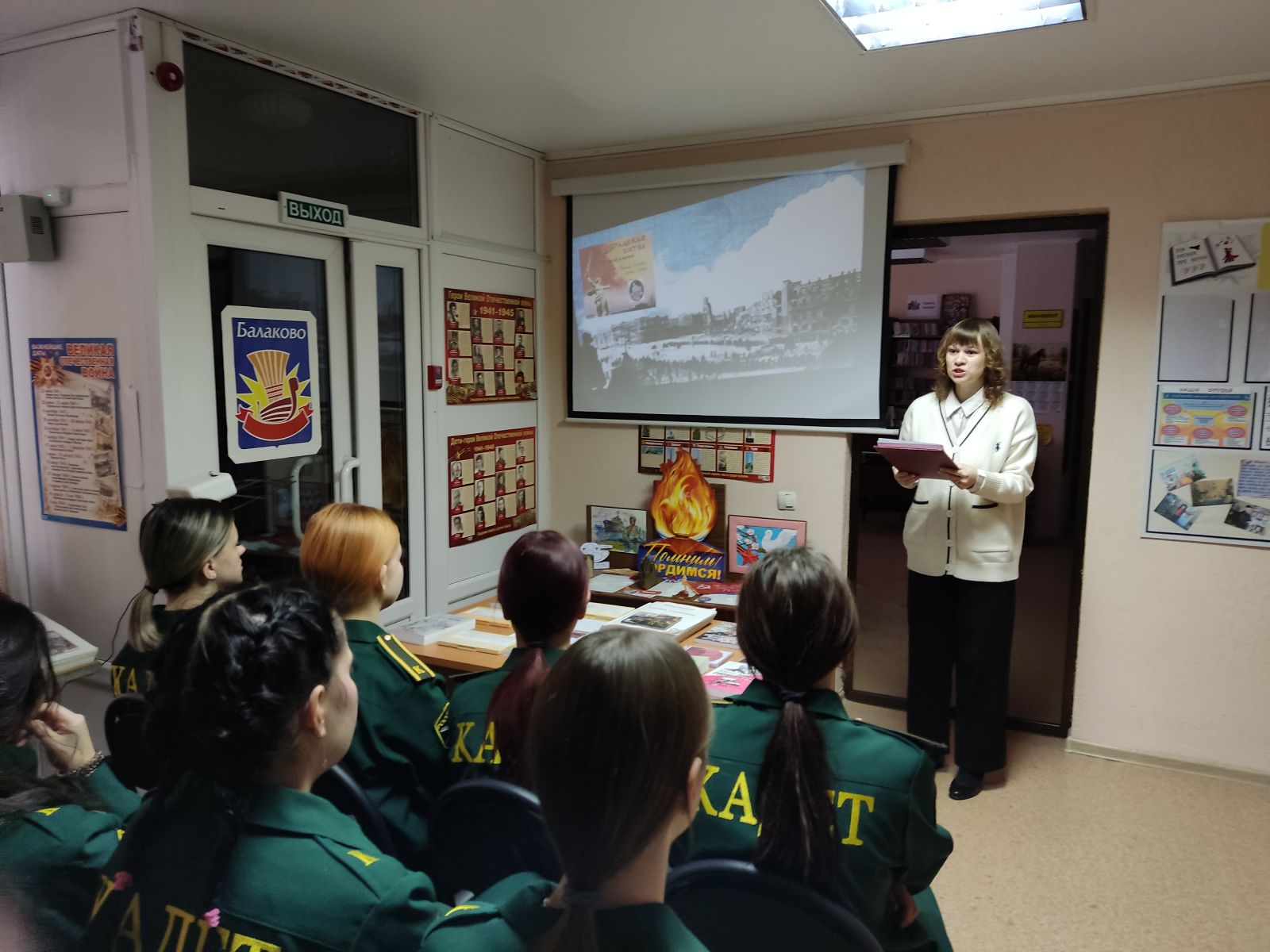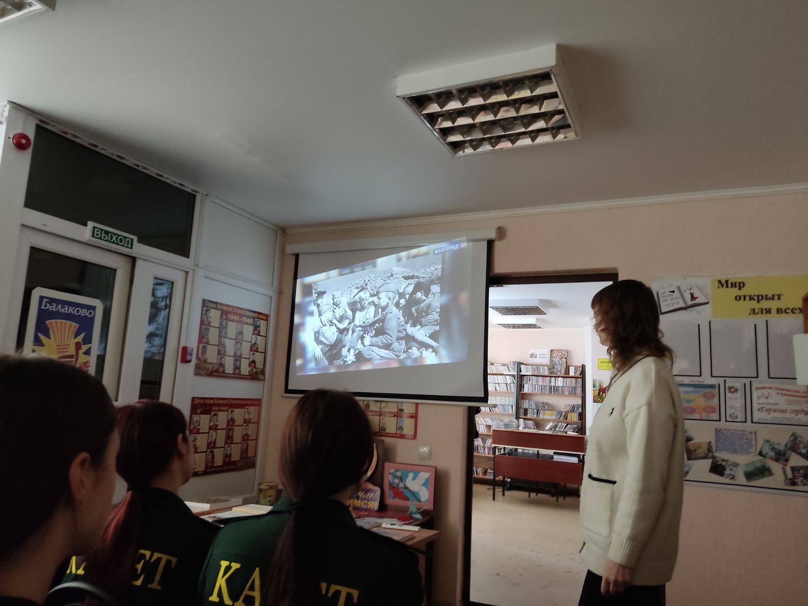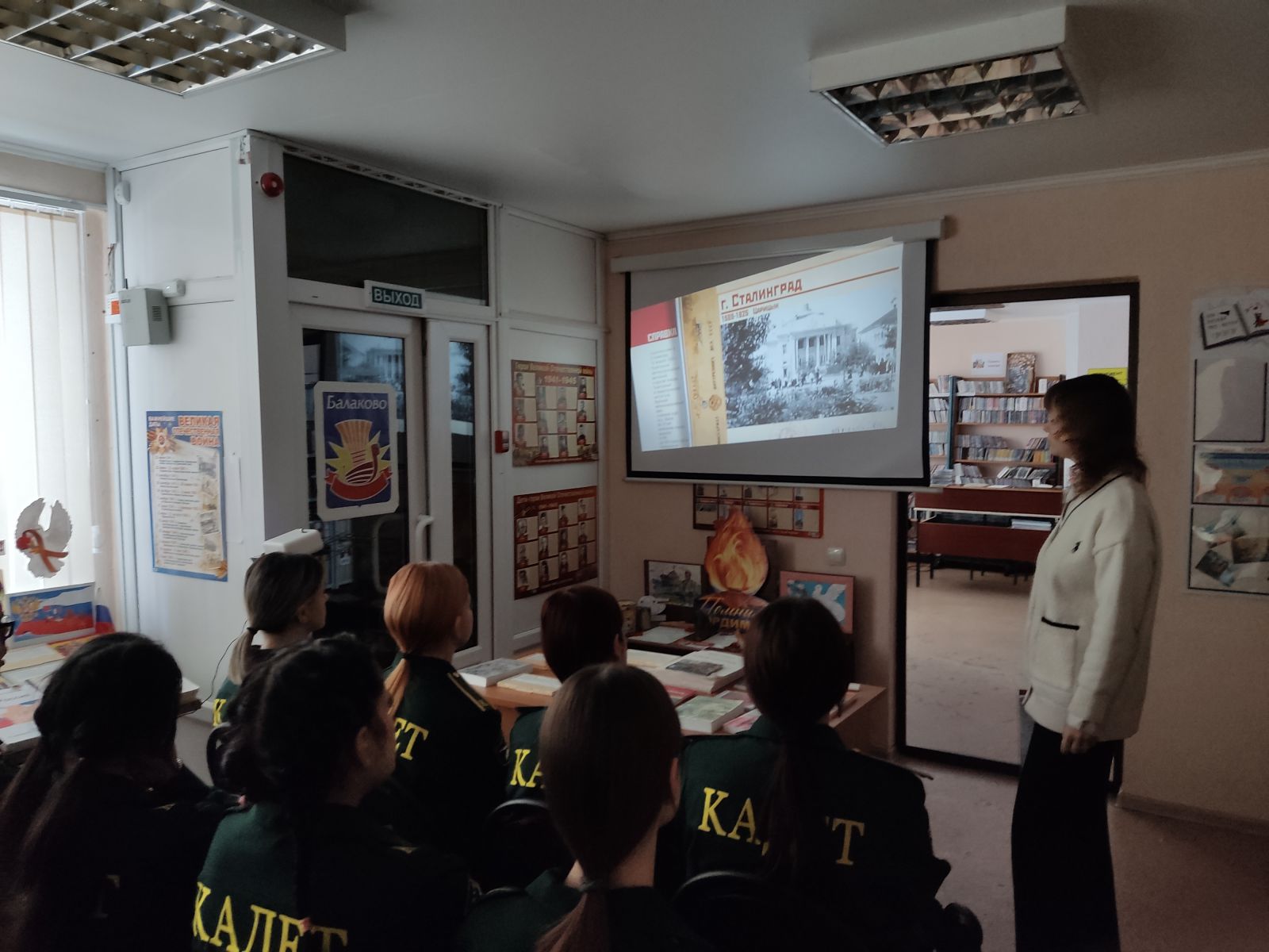 Балаковский филиал Областной специальной библиотеки для слепых провёл для студентов ГАПОУ СО «Губернаторский колледж» историко-патриотический вечер «Мать Родина! Мы насмерть здесь стоим ...», посвящённый Дню разгрома советскими войсками немецко-фашистских войск в Сталинградской битве. Мероприятие рассказало о дне воинской славы России – Дне разгрома советскими войсками немецко-фашистских войск в Сталинградской битве, о ходе одного из важнейших и крупнейших генеральных сражений Второй мировой и Великой Отечественной войн; книжная выставка познакомила с литературными произведениями о Сталинградской битве, рассказывающими о невероятной силе духа советских людей, о героизме взрослых и детей, воевавших за мирное небо над головой.