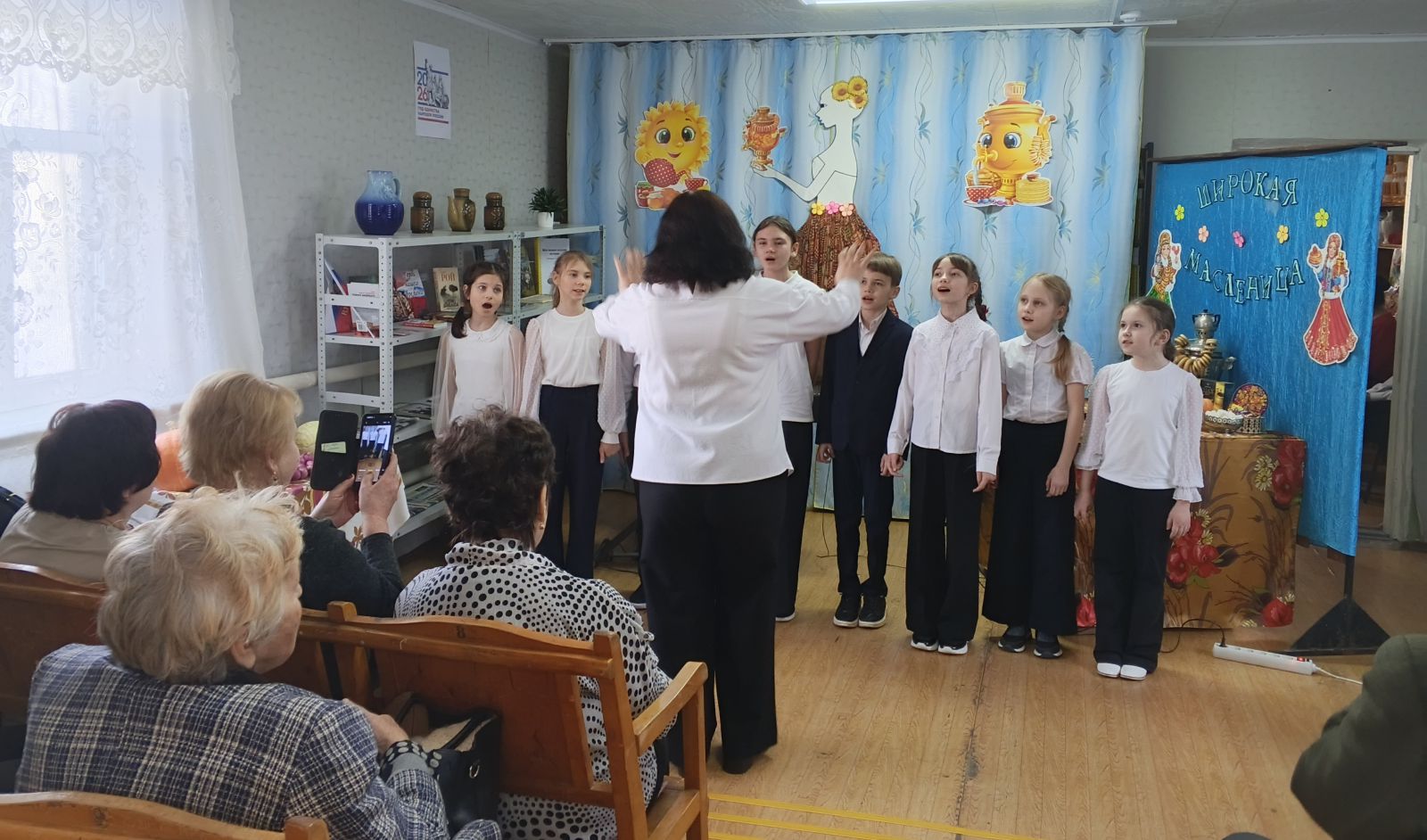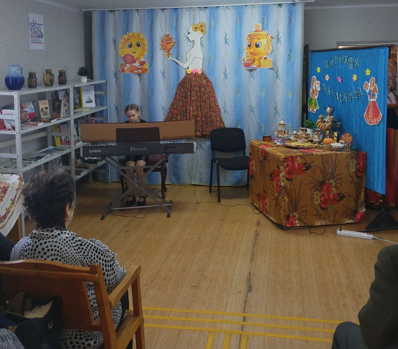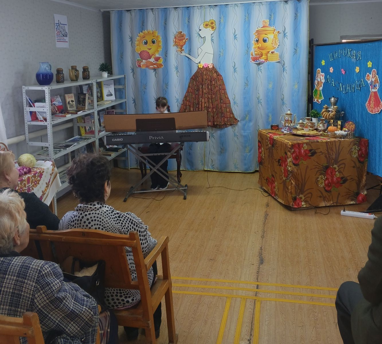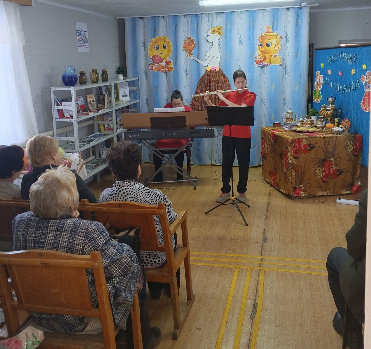 В начале фольклорных посиделок «Русская старинная, румяная да блинная», посвящённых встрече Широкой Масленицы, ведущая рассказала об истоках возникновения праздника, о традициях празднования Масленицы на Руси, о народных поверьях и обрядах. На мероприятии звучала веселая народная музыка в исполнении преподавателей и учащихся Детской школы искусств, создавая настроение радости и веселья. Гости с удовольствием вспомнили пословицы и поговорки о Масленице, о блинах. Развлекательная программа прошла в тёплой обстановке и вызвала положительные эмоции у всех присутствующих.