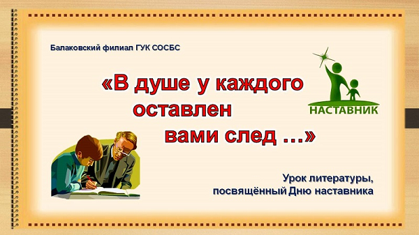 Школьники узнали о празднике День наставника, о роли учителей в годы Великой Отечественной войны. Юные читатели познакомились с творчеством писателей, в жизни которых важной частью была педагогика, рассуждали о поступках героев, ознакомились с книгами писателей и поэтов – наставников молодёжи - произведениями, которые учат искусству быть человеком – добрым, честным, искренним и справедливым.