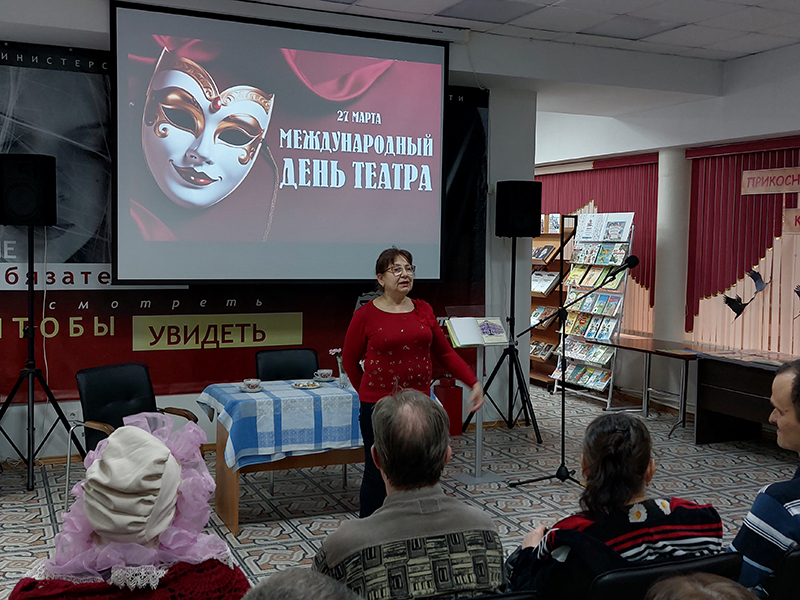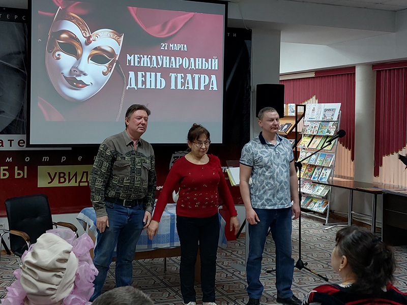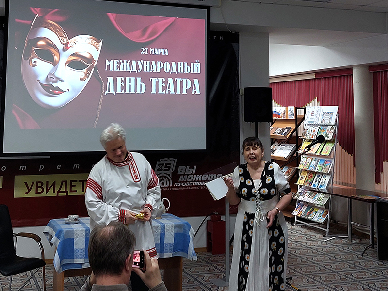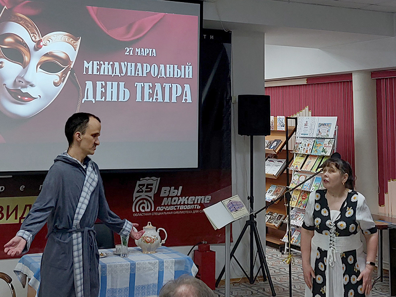 Главным событием дня стало выступление театрального коллектива «Оптимист», работающего на базе Саратовской региональной организации ВОС. Для этого коллектива библиотека давно стала родным домом, а их выступления превратились в добрую традицию, собирающую полные залы. Название театра полностью отражает его суть: вот уже не одно десятилетие «Оптимисты» доказывают, что для таланта и жажды жизни нет преград. Как и положено истинным служителям Мельпомены, свой профессиональный праздник артисты встретили «в строю», на импровизированной сценической площадке библиотеки.