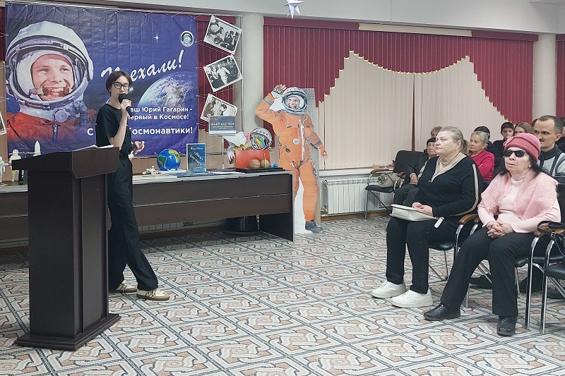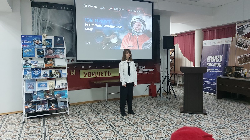 После поэтической части выступила лектор Российского общества «Знание» Ольга Лисицына. Её рассказ был посвящён Юрию Гагарину. Слушатели узнали о детских годах космонавта, учёбе в Саратове, начале лётной практики и триумфальном возвращении на саратовскую землю. Ольга Лисицына подробно остановилась на том, как проходил отбор кандидатов: речь шла о Григории Нелюбове и Германе Титове, но выбран был именно Гагарин. Лектор описала запуск и первый полёт, а также привела историю из периода всемирной известности — о пуговицах, которые космонавт брал с собой, и о его целеустремлённом характере, проявившемся ещё в Оренбургском лётном училище.