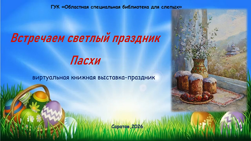 В преддверии светлого праздника Пасхи, который в 2026 году православные отмечают 12 апреля, центр адаптивного чтения библиотеки подготовил виртуальную книжную выставку-праздник “Встречаем светлый праздник Пасхи”.
