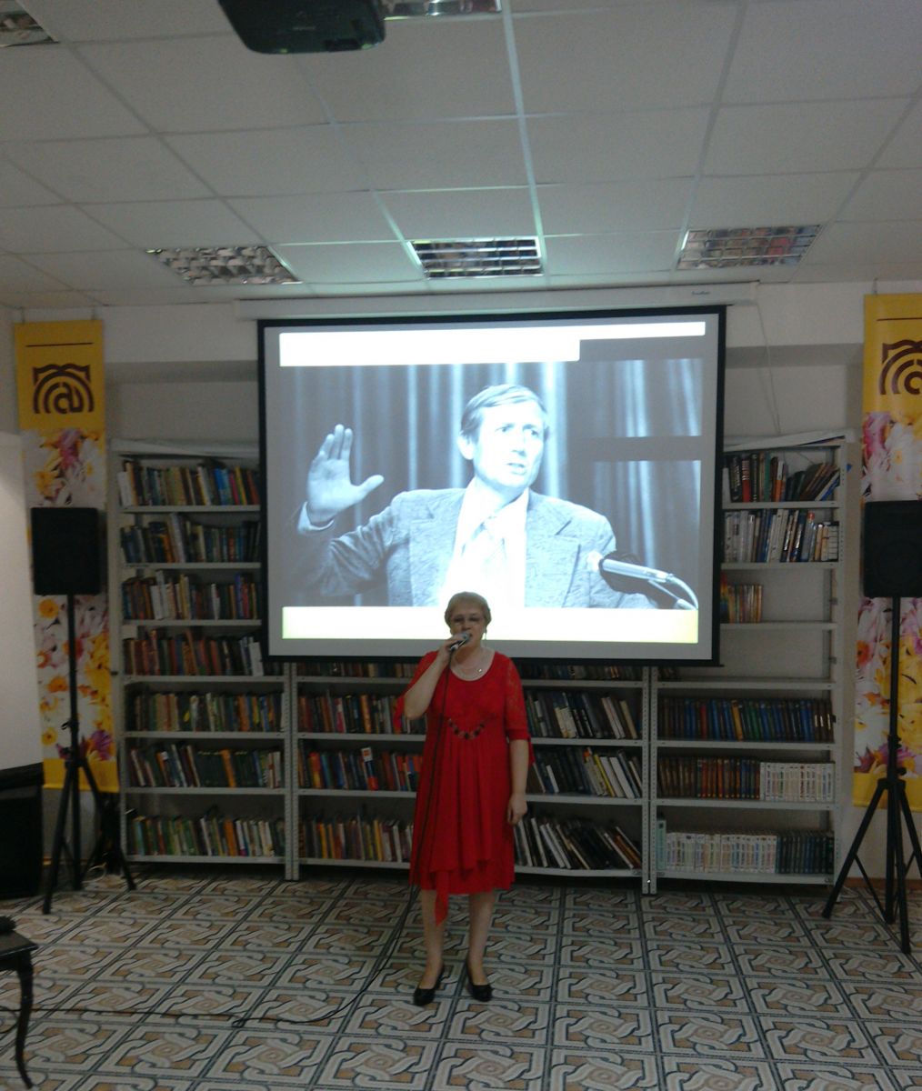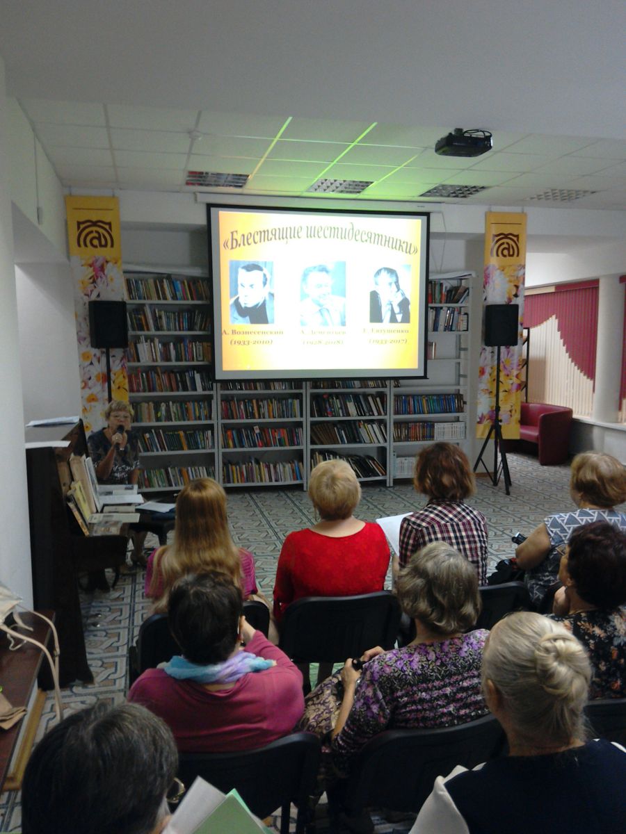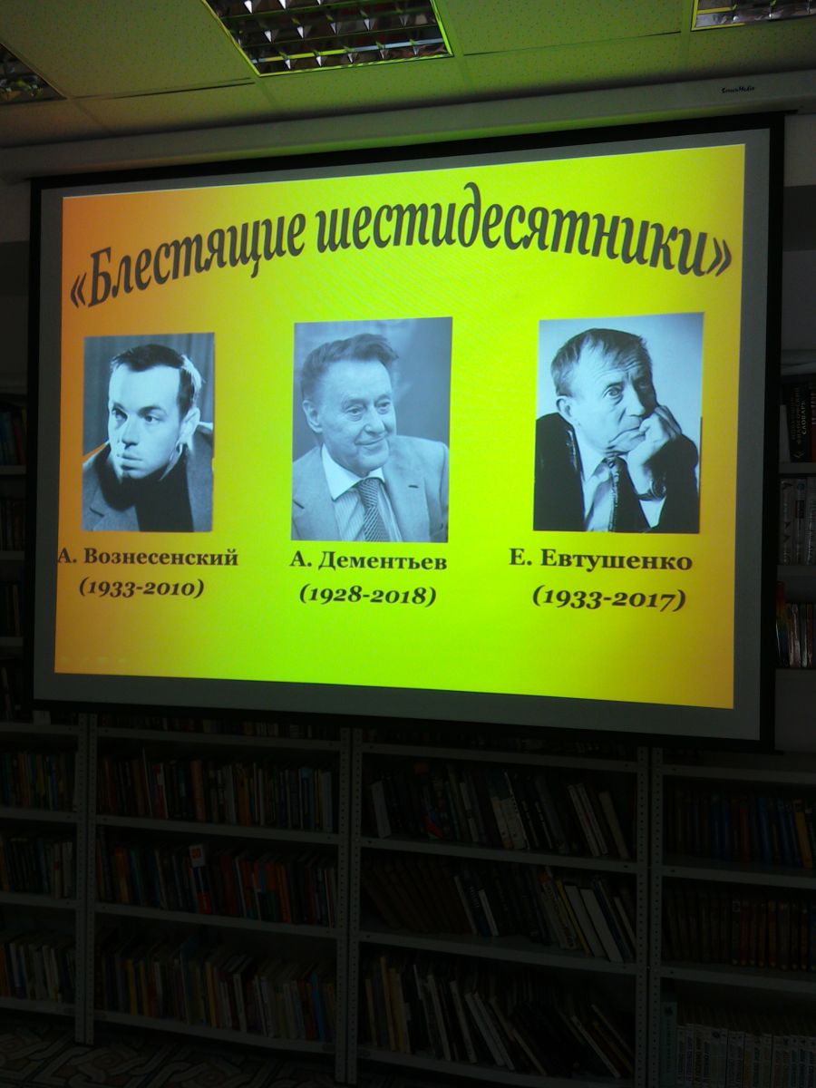 Современные мультимедийные средства позволили услышать читателям голоса Евгения Евтушенко, Андрея Вознесенского, Андрея Дементьева. Проникновенное исполнение стихотворений и песен не оставило равнодушным зрителей, и вызвало желание перечитать произведения поэтов-шестидесятников, которые были широко представлены на различных форматах на выставке в фойе библиотеки.