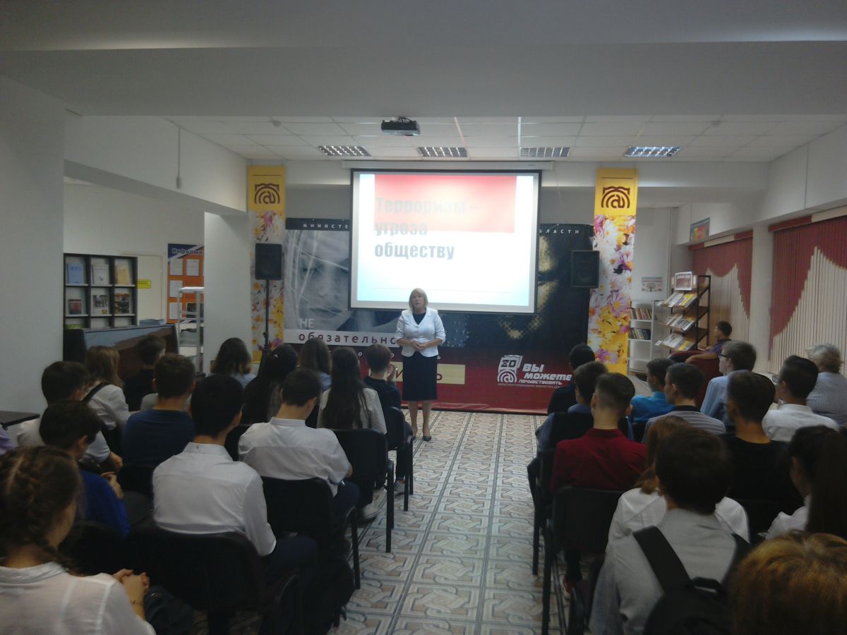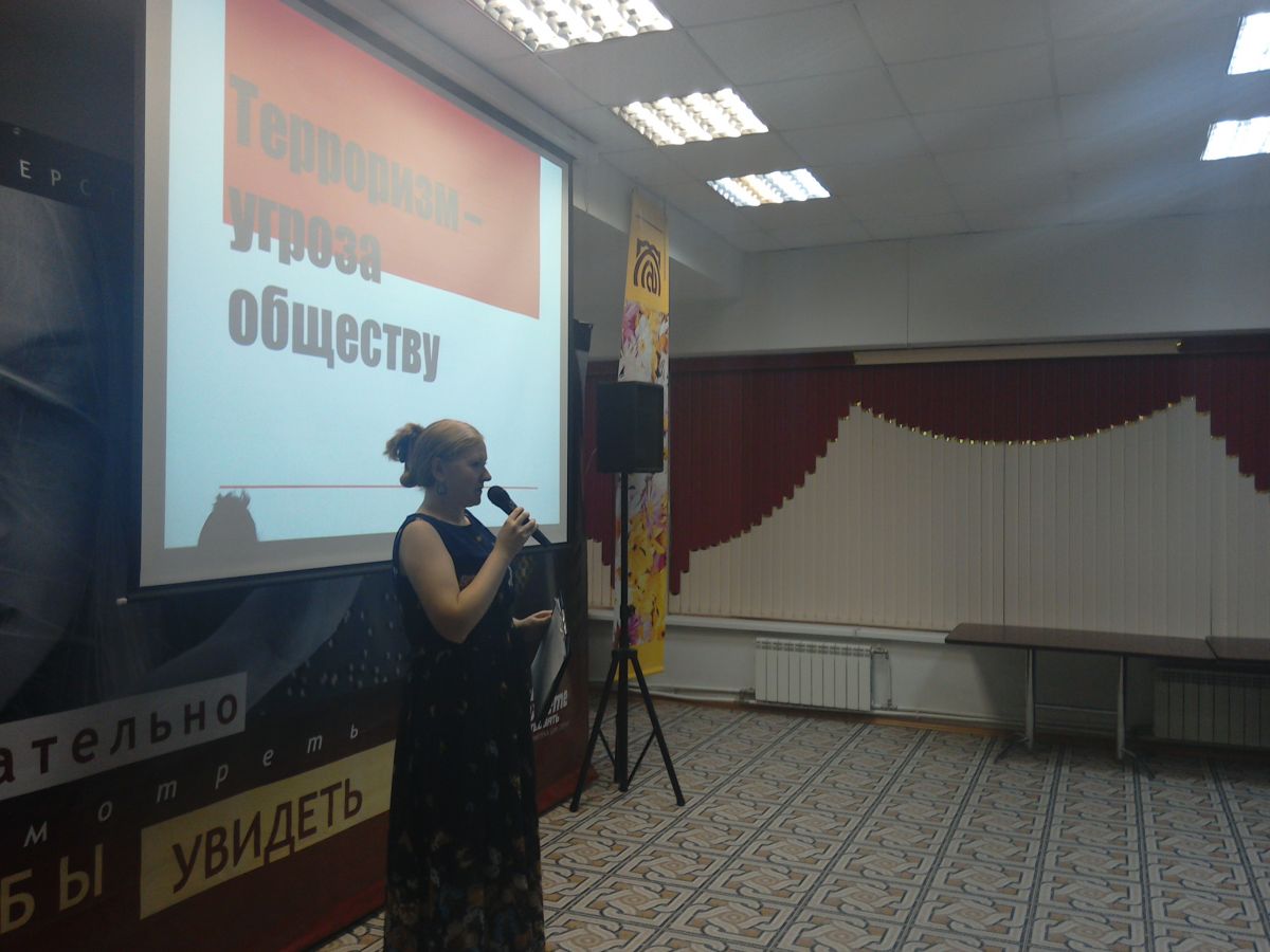 Ведущая мероприятия К.Е. Голубь познакомила учеников СОШ №2 им. В.П. Тихонова, присутствовавших на мероприятии, с историей Дня солидарности в борьбе с терроризмом, рассказала о типах современного терроризма. В оживлённом диалоге с присутствующими прошло обсуждение таких вопросов как: что такое гражданская бдительность? Как не стать жертвой теракта? Какие действия необходимо применить при обнаружении подозрительных предметов? и др.