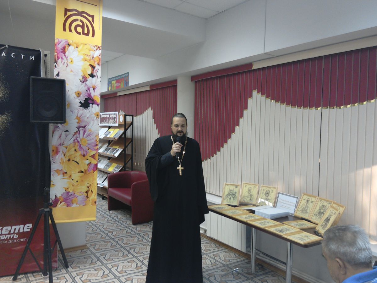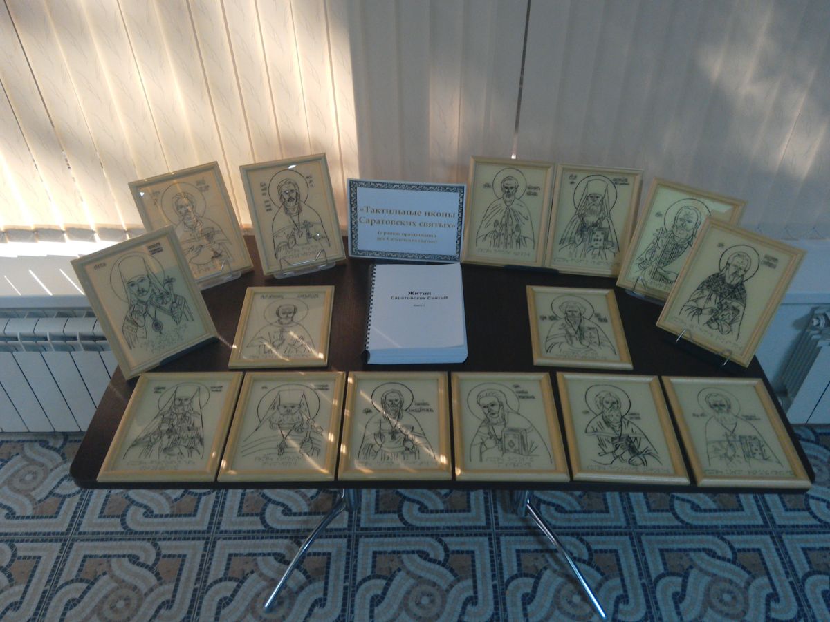 12 сентября в Областной специальной библиотеке для слепых открылась выставка «Тактильные иконы Саратовских святых», и прошла презентация книги «Жития Саратовских святых», изданной сектором по выпуску литературы для слепых и слабовидящих шрифтом Брайля в рамках совместного проекта с Покровским храмом. Мероприятие открыл клирик Покровского храма священник отец Кирилл. Это первая книга проекта, о совместных дальнейших издательских планах рассказал заведующий сектором по выпуску изданий для слепых и слабовидящих Геннадий Генералов.