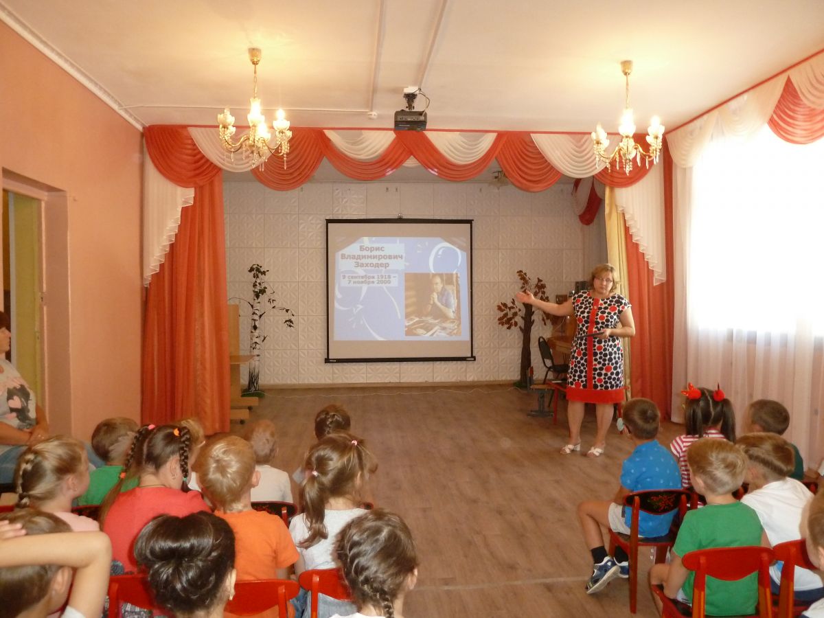 После прочтения письма «Товарищам детям», написанного Борисом Заходером всем детям, малыши вместе с библиотекарем отправились в удивительное путешествие по творчеству поэта. Ребята посмотрели отрывок из передачи «Будильник», в которой писатель и поэт рассказывает о своих произведениях, призывающих беречь природу, животных, и окружающий мир.