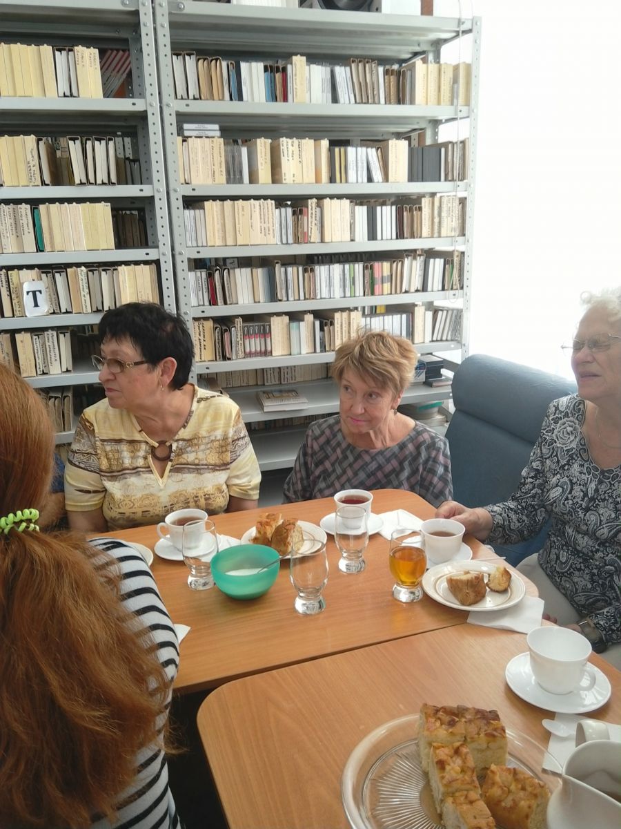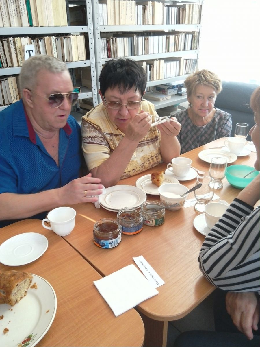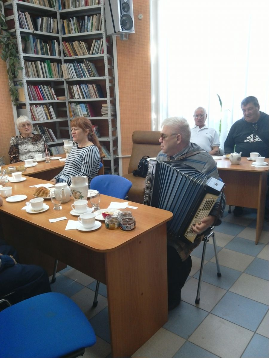 Читателей угощали чаем с яблочными пирогами и яблочным соком, приготовленными сотрудниками. В заключении все вместе пели песни и частушки под баян.