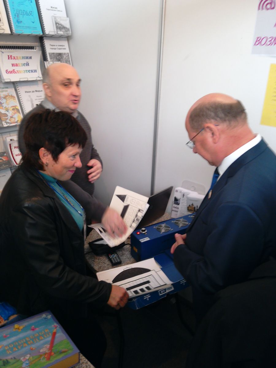 Большой интерес посетителей вызвал рассказ о работе издательского центра библиотеки – репродуцирование книг на различные носители. Один из издательских процессов был продемонстрирован всем желающим. На нагревателе Zy-fuse standart для объемной тактильной печати с помощью рельефообразующей бумаги плоские изображения превращались в объемные картинки.