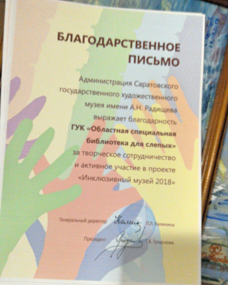 Коллектив Областной специальной библиотеки для слепых был отмечен благодарственными письмами за творческое сотрудничество и активное участие в проекте «Инклюзивный музей 2018».