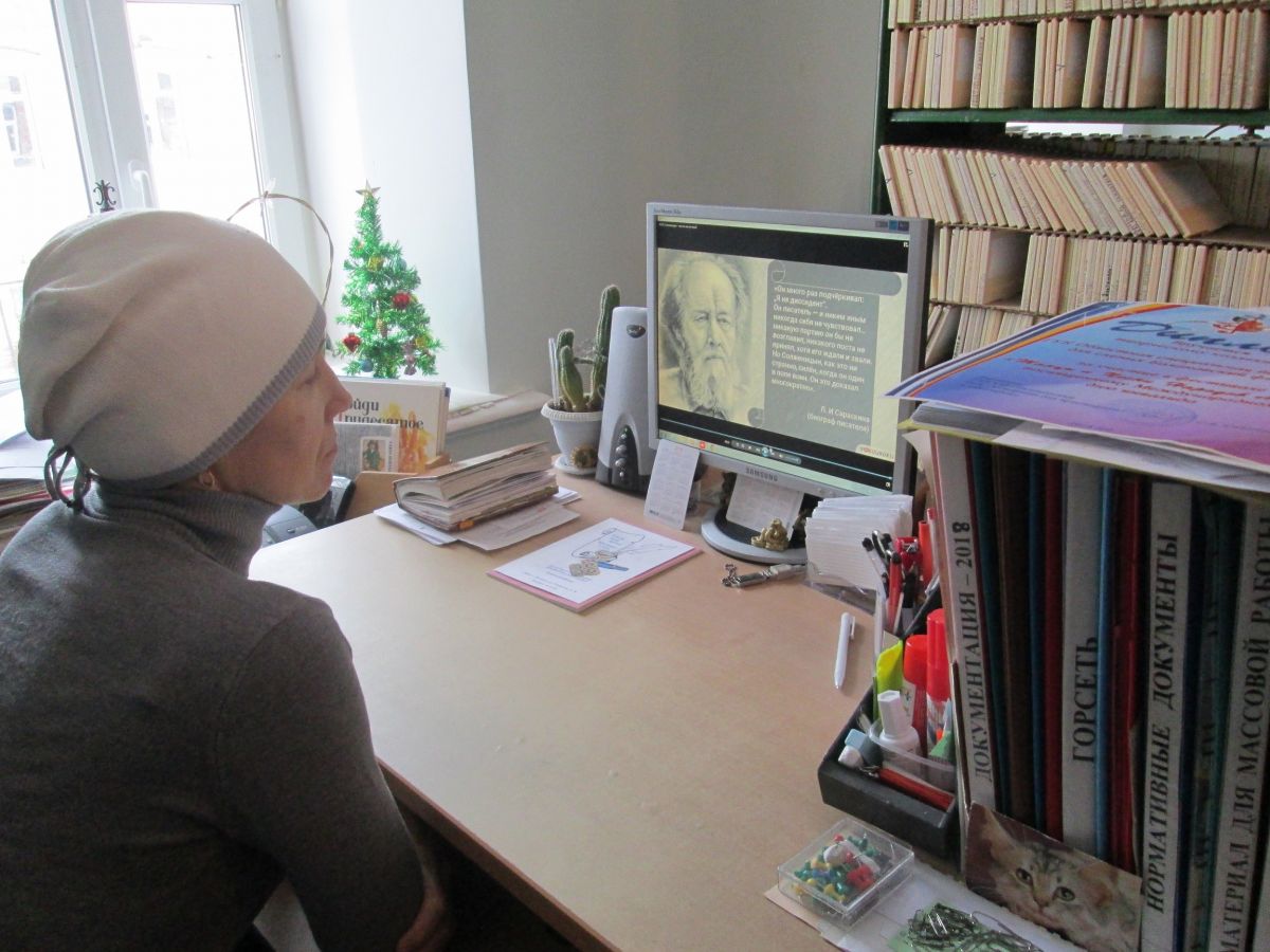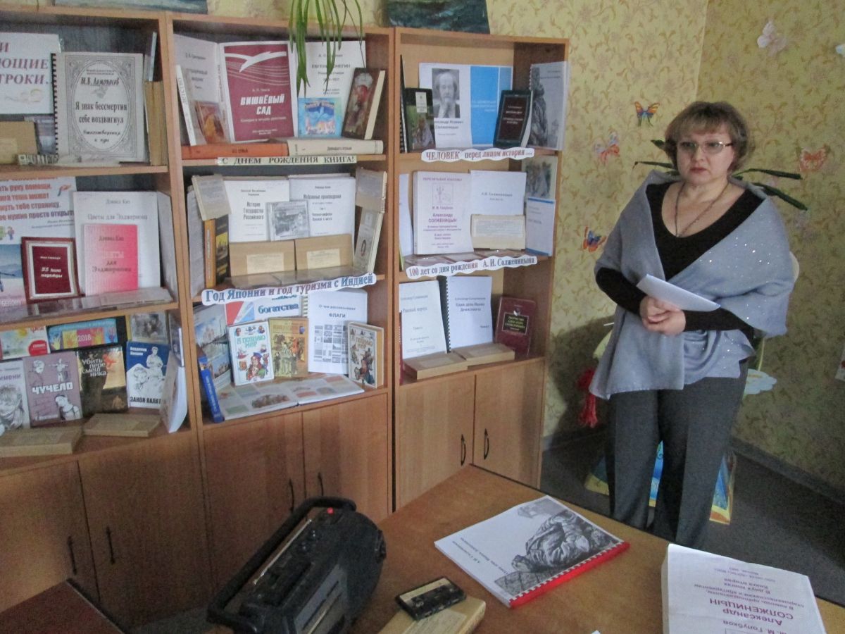 В эти дни читатели библиотеки знакомились с основными этапами жизни и творчества писателя, с непростой судьбой человека, пережившего гонения и признания, ставшего символом эпохи. В течение нескольких дней можно было увидеть презентации и видео об Александре Солженицыне, услышать аудиозаписи его произведений, поучаствовать в громких чтениях по его литературному наследию. Помощь в проведении громких чтений оказали волонтеры Балаковского медицинского колледжа (общественная молодежная организация «Гармония души и тела», руководитель – Галина Пруцкова). С книжной выставки «Человек перед лицом истории…» можно было взять произведения писателя на различных носителях.