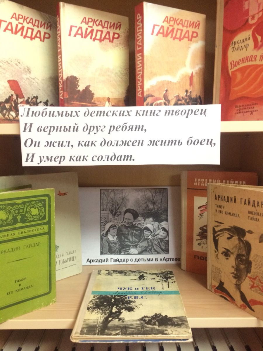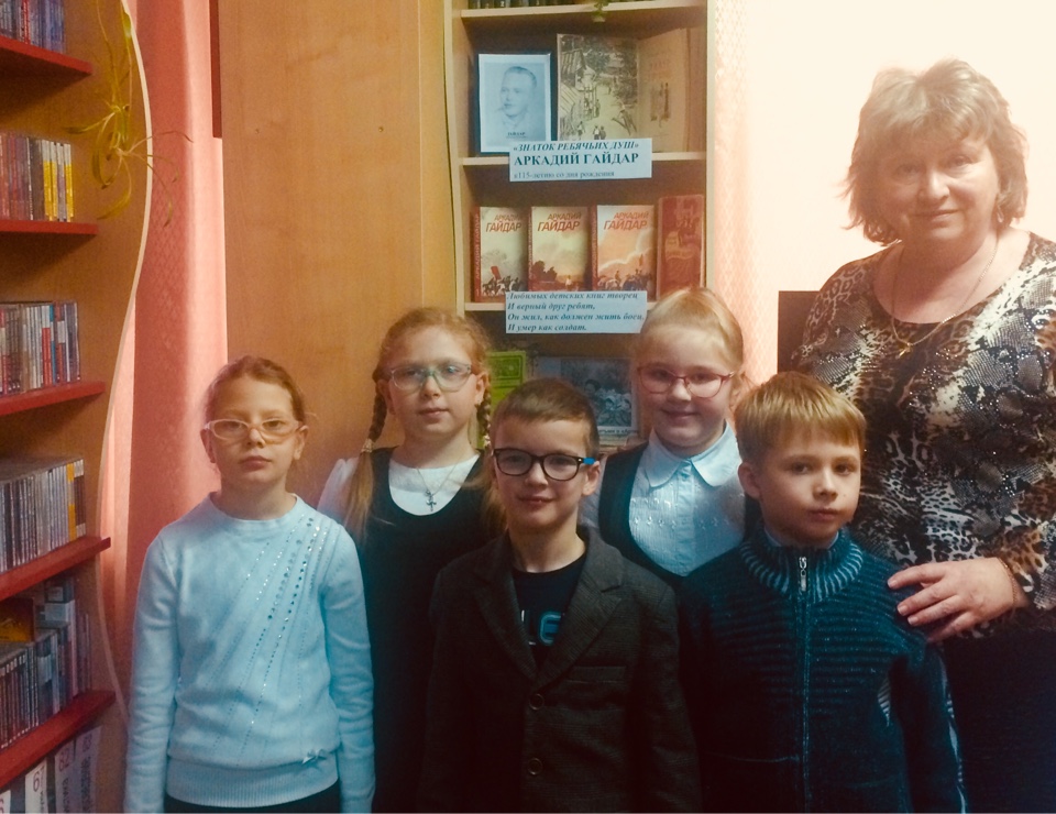 На встрече обсудили с ребятами наиболее известные произведения Гайдара - «Судьба барабанщика», «Чук и Гек», «Военная тайна», «Горячий камень», «Голубая чашка». Дети с удовольствием читали и слушали отрывки из произведений и маленькие рассказы А.П. Гайдара. Заинтересовал ребят мультфильм «Сказка о Мальчише - Кибальчише». И, конечно же, не могли не остановились на повести «Тимур и его команда». С этим произведением произошло небывалое: литературные герои шагнули в реальную жизнь. Несколько десятков лет в нашей стране тимуровские команды действовали во всех городах и селах. Сегодня тимуровское движение не ушло: тех, кто сегодня реставрирует памятники, собирает игрушки для детских домов, ухаживает за стариками, приводит в порядок улицы, очищает от мусора леса, называют волонтерами.