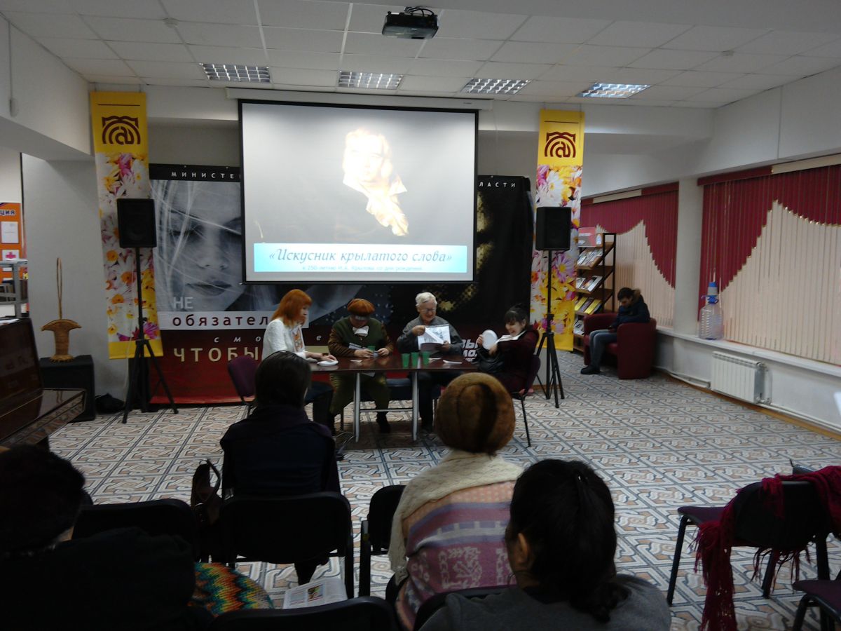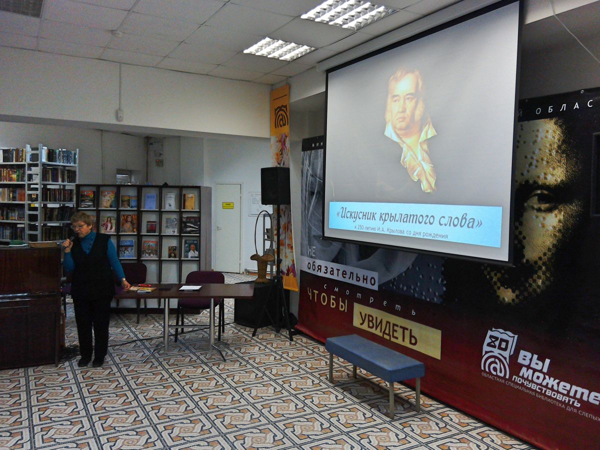 13 февраля 2019 года в ГУК «Областная специальная библиотека для слепых» в Детском парке состоялось мероприятие Минуты радостного чтения «Искусник крылатого слова», посвящённое 250-летию со дня рождения русского поэта, баснописца, издателя сатирико-просветительских журналов Ивана Андреевича Крылова (1769 – 1844).