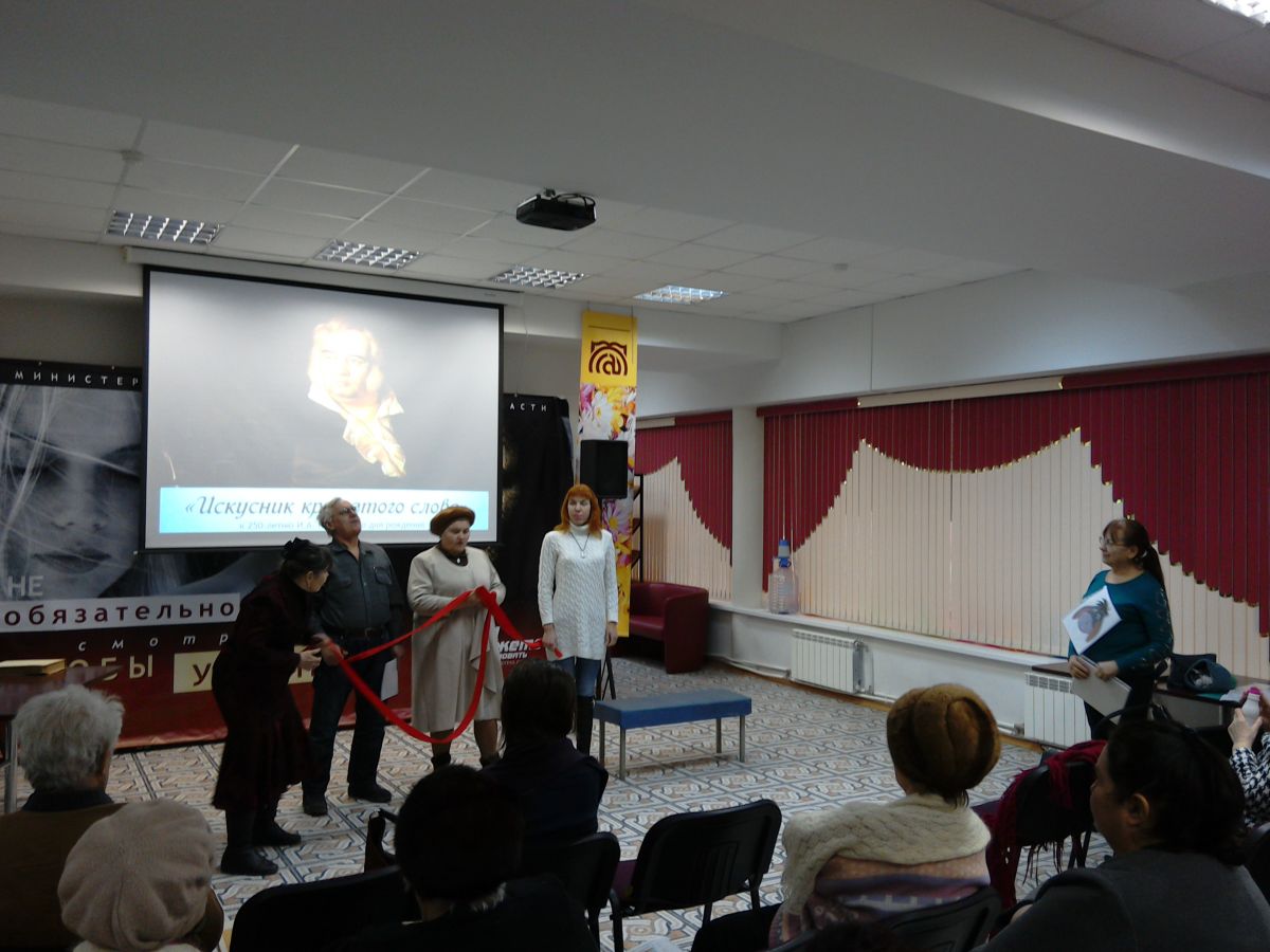 Ведущая мероприятия Т.Т. Немцова познакомила читателей библиотеки с биографией знаменитого баснописца, рассказала о его творческом пути. В рамках Года театра театральный коллектив «Оптимист» МО ВОС представил сценки по басням Крылова «Осёл и соловей», «Лебедь, рак и щука», «Обед у медведя». Читатели библиотеки Ф.П. Бородин, Е.М. Волкова, А.Р. Неуструева прочитали басни «Стыдливый игрок», «Мартышка и очки», «Лисица и сурок». Гость библиотеки писатель-краевед Юрий Леонидович Чернышев рассказал присутствующим о жизни И.А. Крылова в Саратовской губернии.