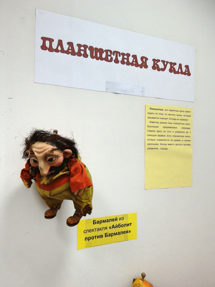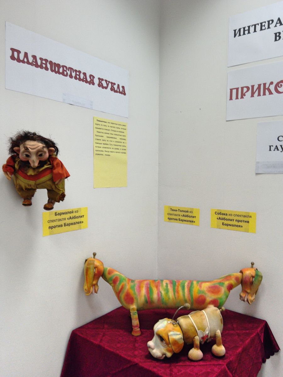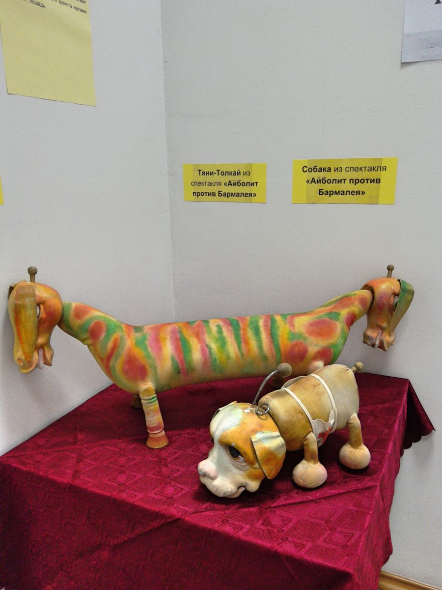 На выставке представлены планшетные куклы – персонажи из спектакля «Айболит против Бармалея»: Бармалей, Тяни-Толкай и Собака.
