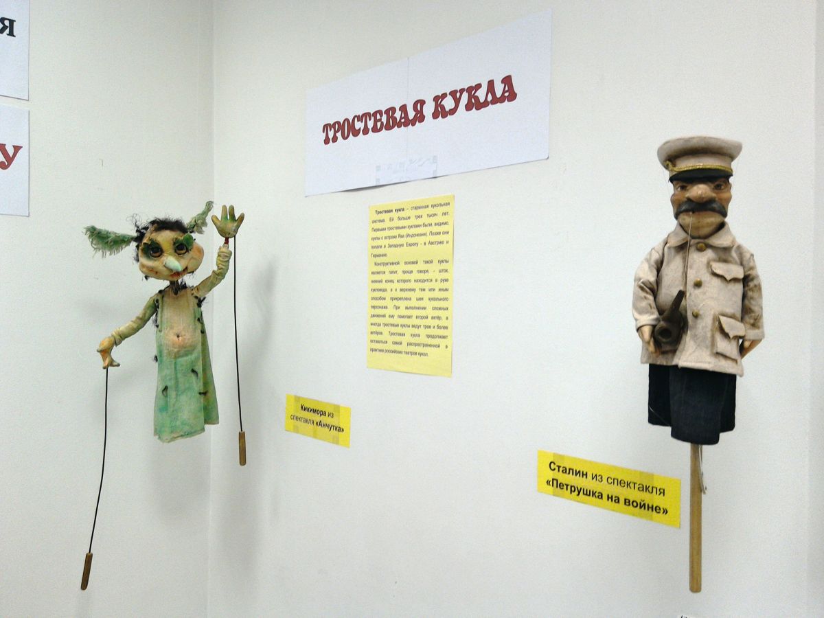 На выставке представлены тростевые куклы – Кикимора из спектакля «Анчутка», Сталин из спектакля «Петрушка на войне».