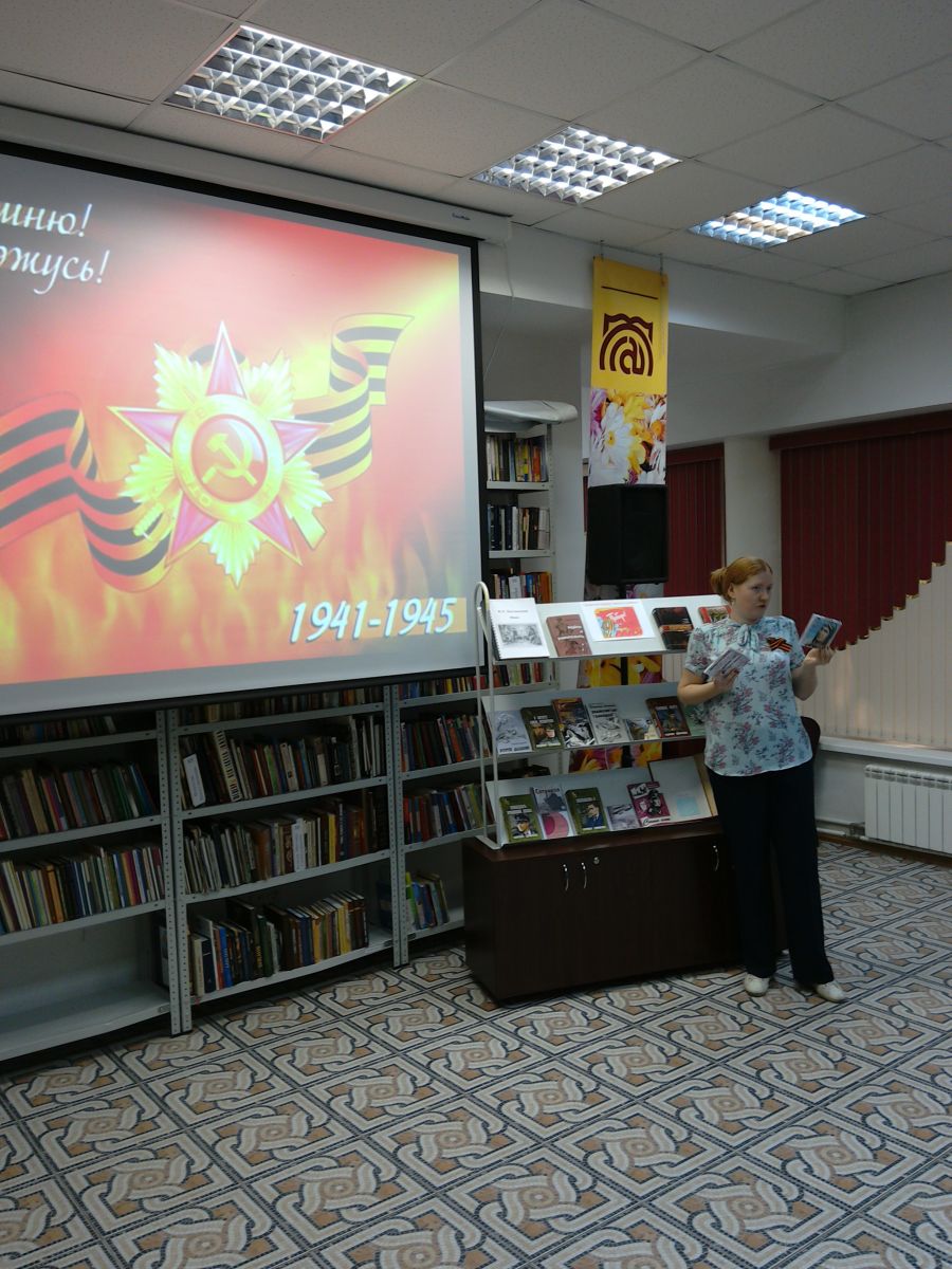 О событиях тех военных лет написано огромное количество художественных и документальных книг, стихов и песен, которые призывают нас помнить о том страшном времени и беречь мир. В библиотеке развёрнута книжная выставка «Дорогая сердцу книга о войне», на которой представлены художественные произведения о Великой Отечественной войне на специальных носителях. Обзор выставки провела сотрудник библиотеки К.Е. Голубь.