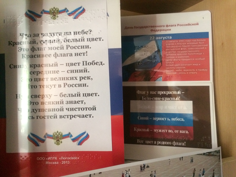 С 21 августа в Детском филиале Саратовской областной специальной библиотеки для слепых организована книжно-иллюстративная выставка «Флаг гордый Родины моей», главной задачей которой является формирование чувства уважения и гордости молодого поколения к своей Родине.