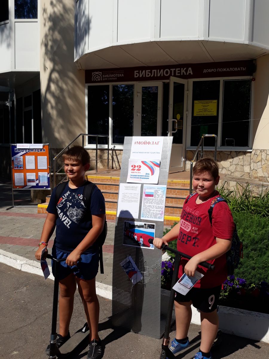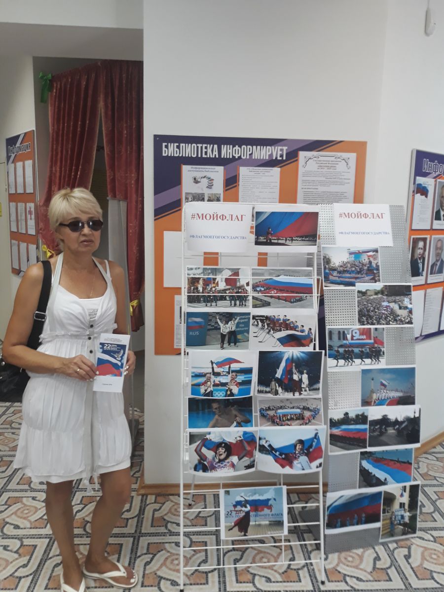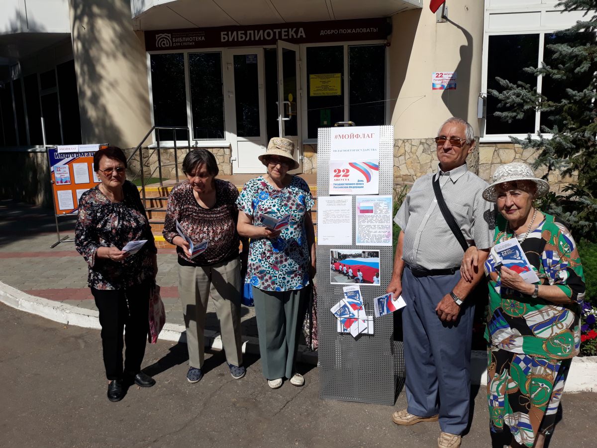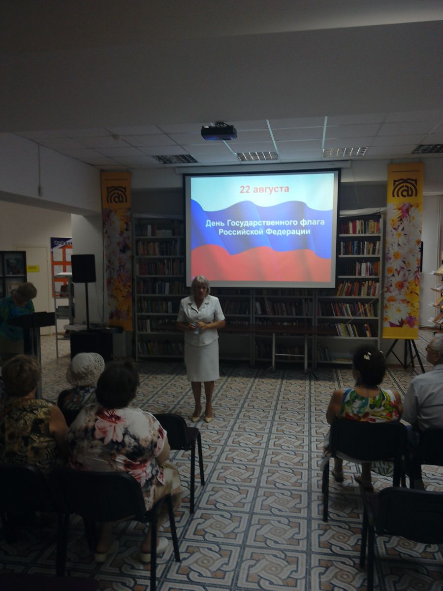 На территории библиотеки прошла тематическая встреча «История флага Российского», участники которой узнали, как флаг родился вместе с первыми Отечественными военными кораблями, что законным «отцом» триколора был признан Петр I. 20 января 1705 года (по старому стилю) он издал указ, согласно которому на военных и торговых судах должны поднимать бело-сине-красный флаг, сам начертал образец и определил порядок горизонтальных полос. В советской России более 70 лет флагом являлся красный стяг. 22 августа в России отмечается День Государственного флага Российской Федерации, установленный на основании Указа Президента РФ от 20 августа 1994 года «О Дне Государственного флага Российской Федерации». 25 декабря 2000 года Президент Российской Федерации В.В. Путин подписал Федеральный конституционный закон «О Государственном флаге Российской Федерации».