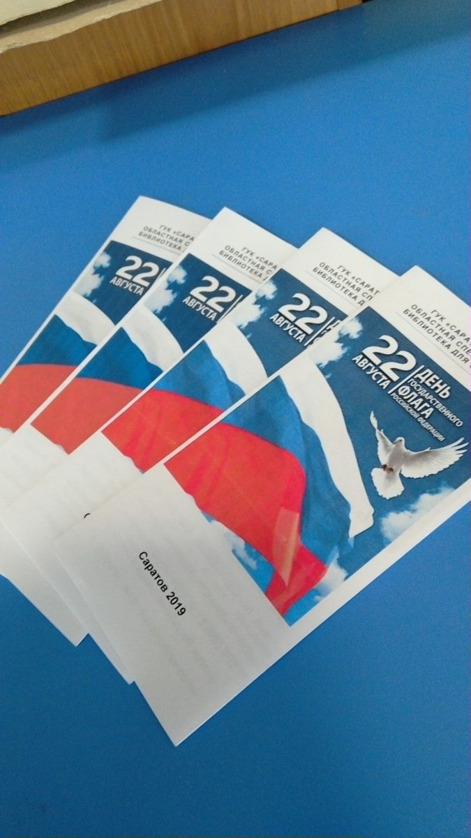 22 августа в России - День государственного флага. В ГУК «Областная специальная библиотека для слепых» по адресу ул. 1-я Садовая, 4 прошла акция ко Дню государственного флага РФ. Акция направлена на укрепление авторитета Российской государственности, нравственно-патриотическое воспитание населения, в частности, воспитание у граждан России уважительного отношения к государственным символам.